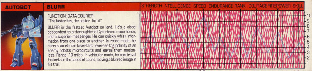 Profile: Blurr is the fastest Autobot in motion and in conversation. He talks non-stop and continuously - if no one tells him to put a sock in it. And he is a superior messenger because he can whisk information from one place to another so fast that he is a blur in motion - hence his name - and almost a blur in giving his report until he's told to slow it down to a thousand words a minute or something somebody can understand. He is rather nervous and high-strung... not unusual for an Autobot who sometimes seems to be part-thoroughbred Cybertronic race horse (if there were such a thing). But he is courageous and loyal and determined to do what's required whether or not it's dangerous.
