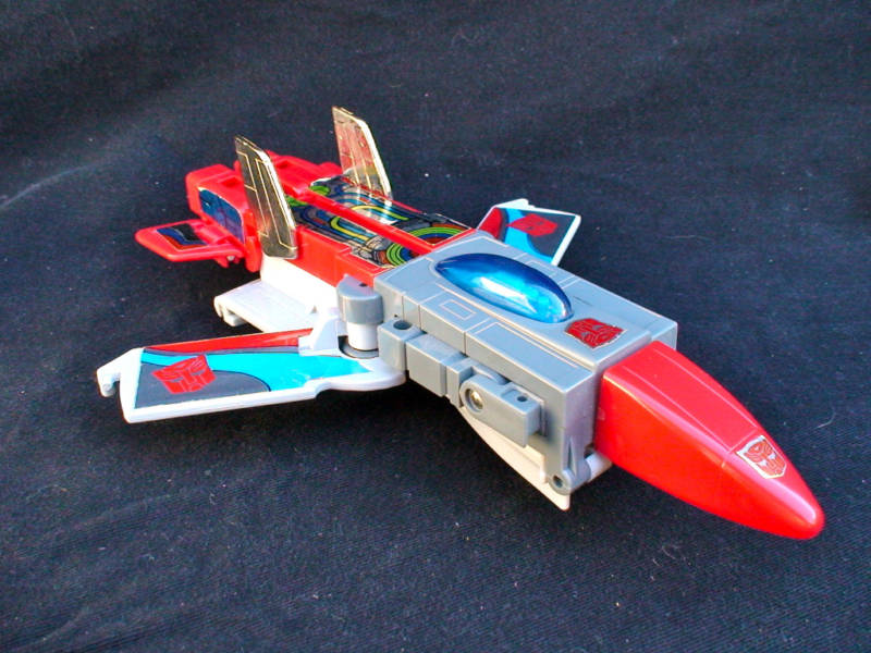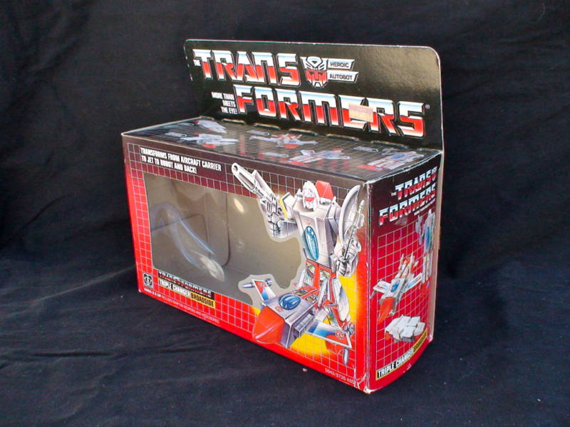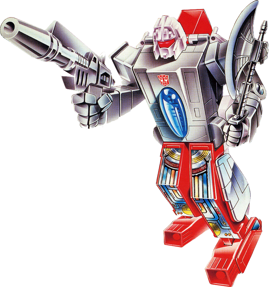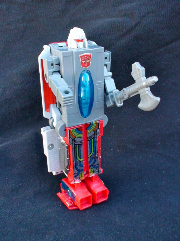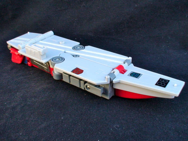 Doesn't like transforming into carrier or jet -- gets seasick on water, has fear of heights. Effective, valiant warrior, but other Autobots wish he wouldn't gripe so much. Expands to 1200ft length as carrier, capable of landing jets and carrying other Autobots. 15,000 mile range, 40 knots maximum speed. Projects 80,000 volt electric field around himself in jet mode. Has high-energy plasma-pulse gun and shattering vibro-ax in robot mode.