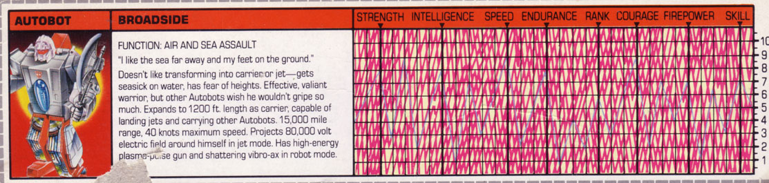 Profile: Broadside is very uncomfortable about transforming to aircraft carrier or jet mode, and with good reason. Floating on water upsets his gyro-balance circuitry, making him feel as if he's functioning at less than peak performance - the mechanical equivalent of seasickness. And he's even more distressed while flying since he has a natural fear of heights. He strongly detests these Earthen forms and is quite vocal about it. But, despite everything, he manages to overcome these problems in battle. He is an effective and valiant warrior, and his fellow Autobots value him for these qualities. They just wish Broadside would do his job without griping so much about it.