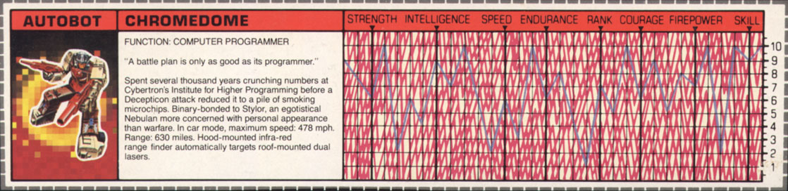 Abilities: In car mode, Chromedome's twin fuel-injected, turbo-charged, side-mounted engines give him a maximum speed of 478 mph on a flat road. His range is 630 miles. His hood-mounted infrared rangefinder automatically targets his roof-mounted dual lasers, which he also uses in robot mode.