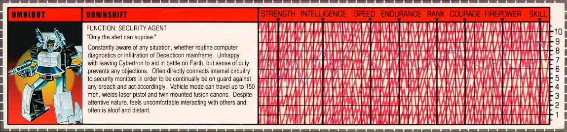 Profile: Constantly aware of any situation, whether routine computer diagnostics or infiltration of Decepticon mainframe. Unhappy with leaving Cybertron to aid in battle on Earth, but sense of duty prevents any objections. Often directly connects internal circuitry to security monitors in order to be continually be on guard against any breach and act accordingly. Vehicle mode can travel up to 150 mph, wields laser pistol and twin mounted fusion canons. Despite attentive nature, feels uncomfortable interacting with others and often is aloof and distant.