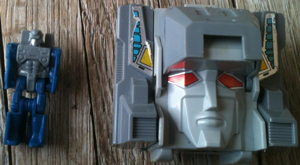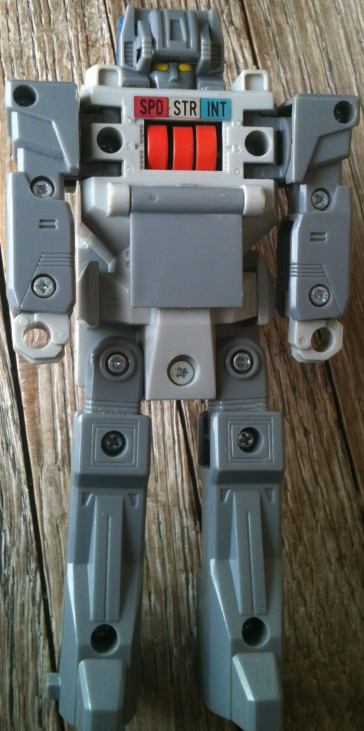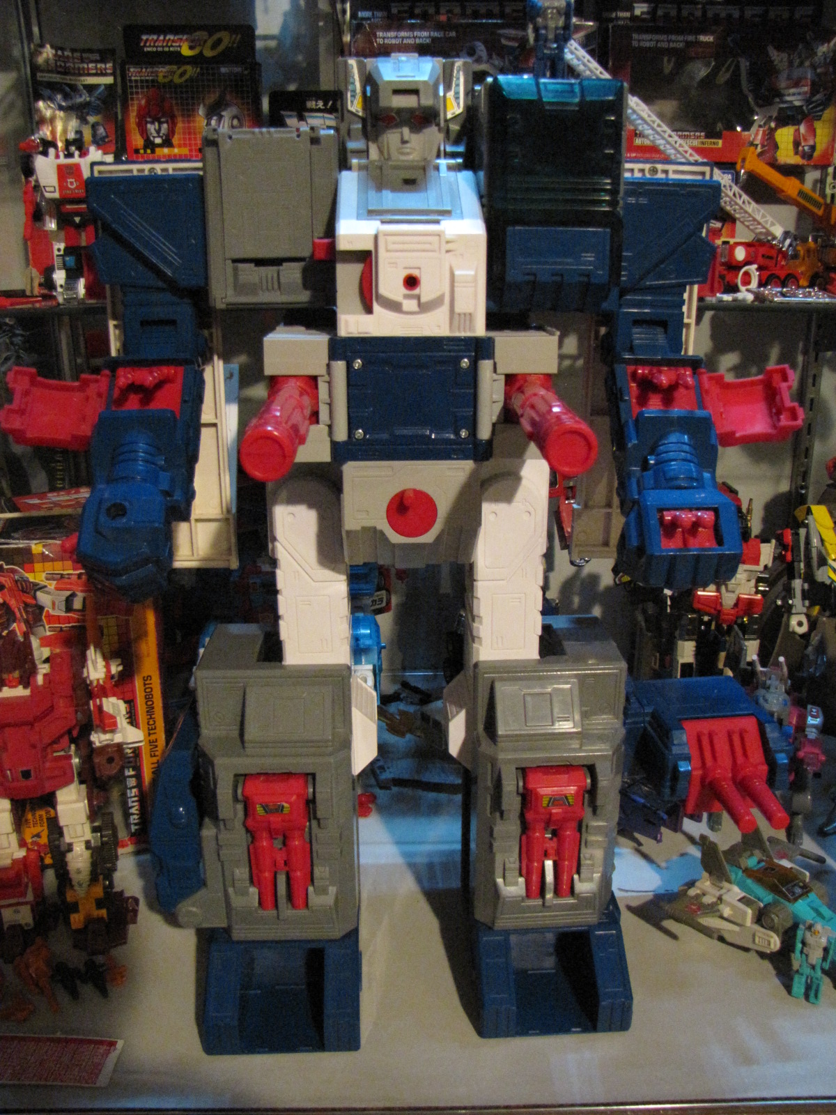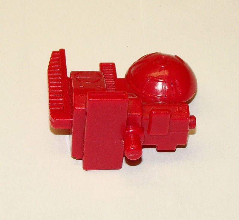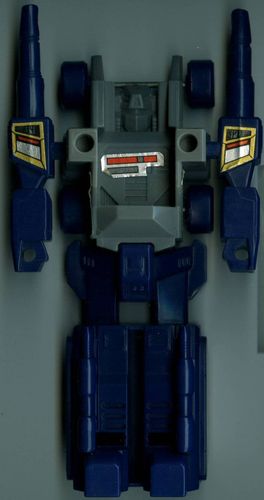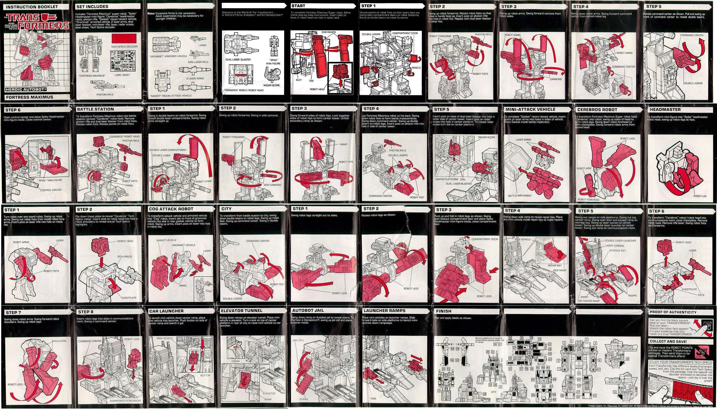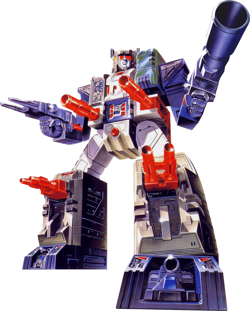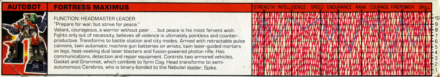 Abilities: In both robot and battle station mode, Fortress Maximus is a walking armory. Retractable pulse cannons (emitting a strong ion beam capable of disrupting and incapacitating internal circuits), twin automatic machine gun batteries (wrist mounted in robot mode), twin laser-guided mortars (in lower legs, robot mode), dual laser blasters (with a heat-seeking target lock system) and a fusion-powered photon rifle make his firepower second to none. His battle station is fully equipped with communication, detection and radar equipment, while his repair bay has extensive re-fit facilities for almost any Transformer and a wide range of spare parts. From either repair bay or battle station Fortress Maximus can operate two remote controlled vehicles, Gasket and Grommet, using them to supply instant battleground first aid/repairs or as offensive/defensive combat units. When in robot mode, Gasket and Grommet combine to form the radio controlled warrior/mechanic, Cog. Fortress Maximus's head transforms into a robot form called Cerebros, which is controlled entirely by his binary-bonded partner. Despite his size, Fortress Maximus is both very strong and very fast. Though seemingly awkward, his bulky configuration moves with well oiled ease. His greatest asset, though, is his vast intellect and capacity for instant tactical decisions. To him, crafting an attack is like blueprinting a structure and it's almost second nature.