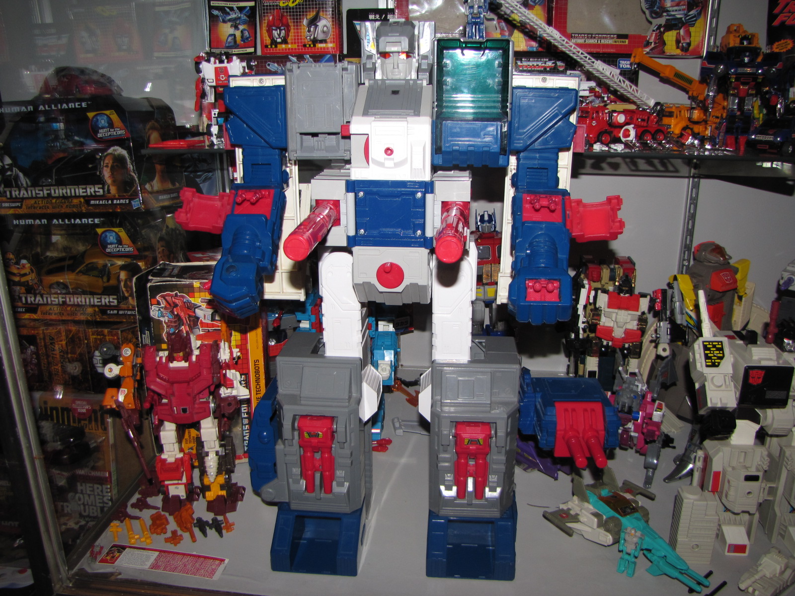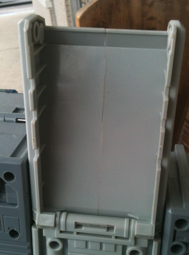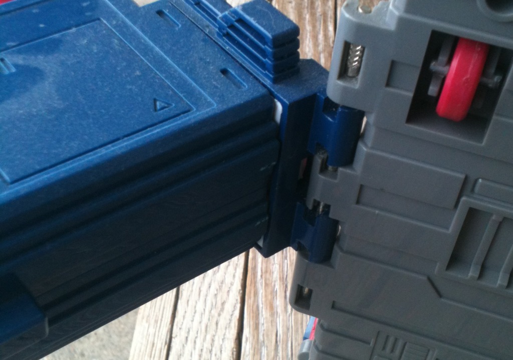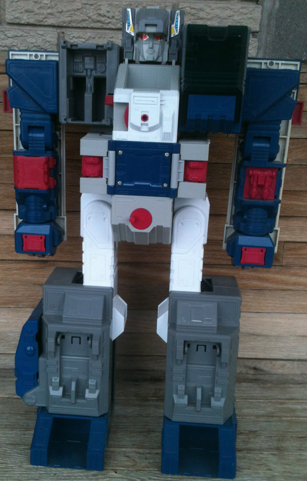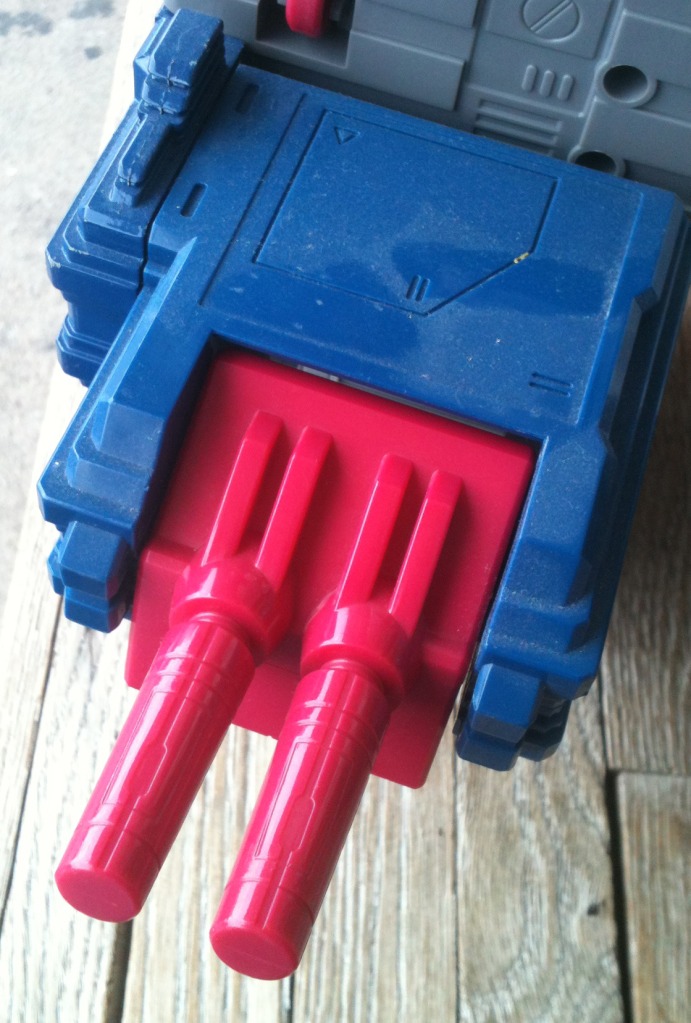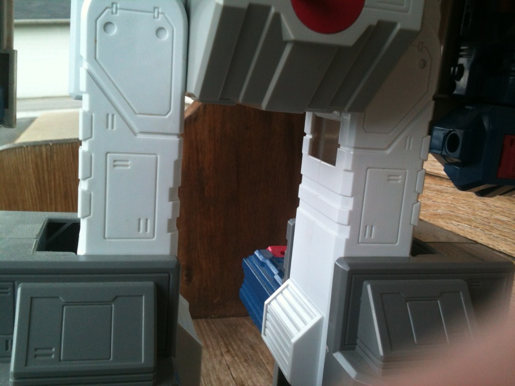 I never had laid eyes on a Fortress Maximus as a kid, so fortunately I didn't know what I was missing. I did read the Marvel comics where he came out in the Headmasters series, and then went to the regular Transformers book. I really liked both the awesomeness of maximus, plus I really dug the storyline of Spike and his brother Buster. He was a pipe dream, but now I finally have him. My own pictures coming soon, but shown here are pictures of him from the auction(s). He is completely unfaded and not discolored at all in his white pieces, which was a considerable part in my deciding to purchase this one. On the not so good side, his clip for one of the towers is chipped, but it doesn't affect his ability to transform and hold okay. He was missing a lot of small parts when i first got him, but I have him mostly completed him as I have purchased his missing arm cannon cover, communication door, the small door below it, one of the small side doors, the main red ramp, The main chest ramp, the side cannons, the Photon Rifle, Dual Laser Blaster, as well as all the parts for Gasket/Grommet, the radar as well as the missing leg cannons. I currently only need to replace Cog's Laser, though I have gotten a duplicated replacement for it until I can find and afford an original.**
