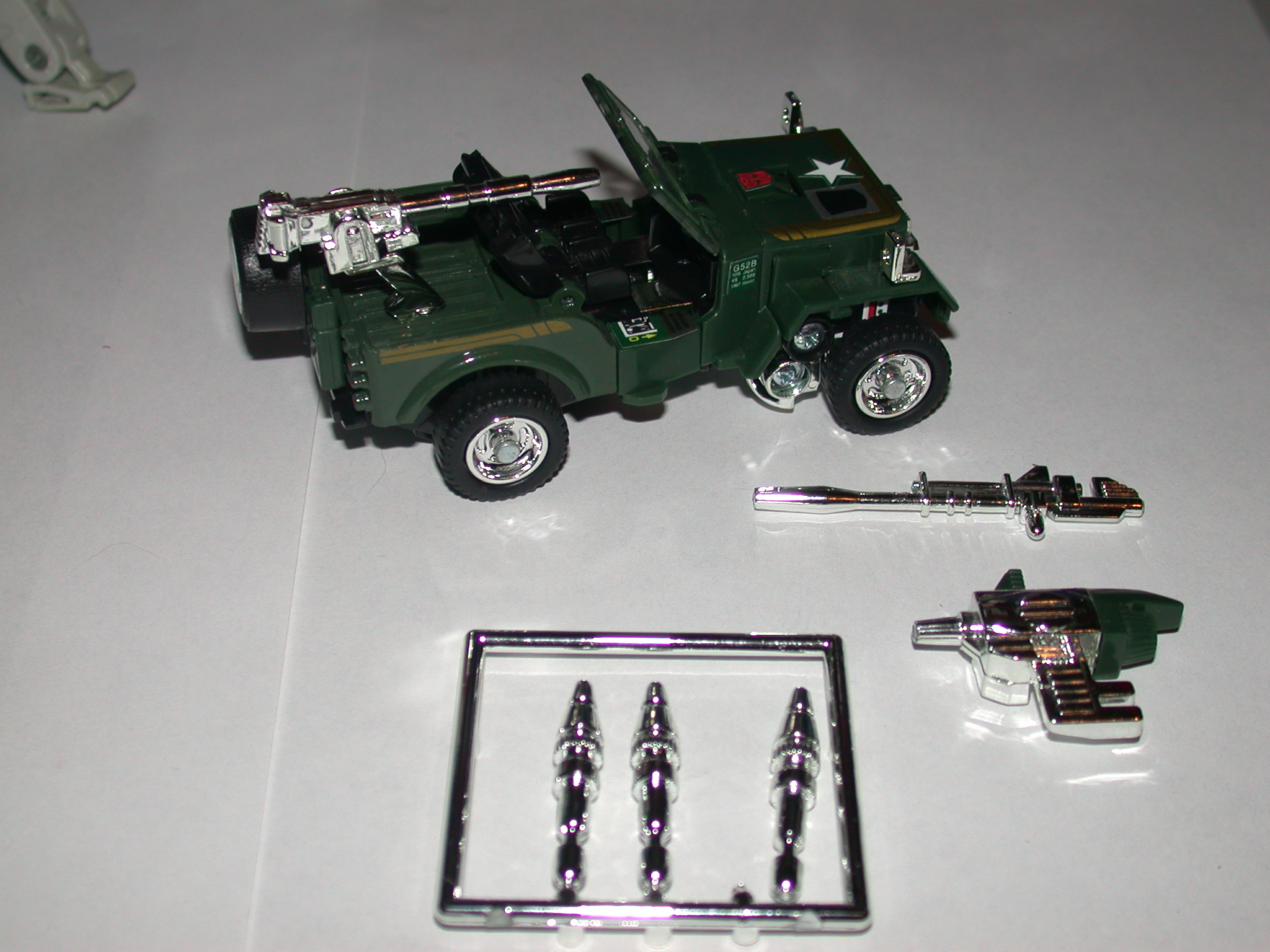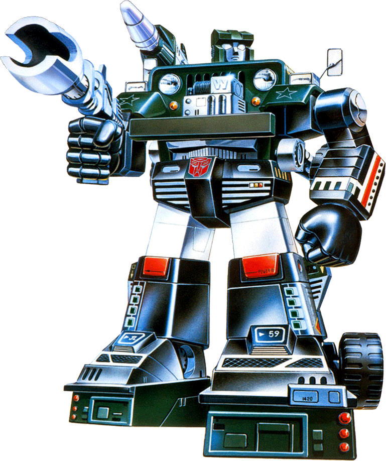 Abilities: While in his jeep mode, Hound uses his turret gun to sweep over the landscape from horizon to horizon, like a radar scope, and, with the help of internal 3-dimensional simulation circuitry, stores this information as a topographical map. Error distortion is no more than one inch per 150 feet distance from point of data collection. In robot mode, Hound's turret gun becomes an infrared radiation collector. It can detect heat differentials as small as .02 degrees Centigrade, and he uses this ability in tracking machines as well as humans. Hound's shoulder-mounted hologram gun can project 3-dimensional grid laser light images of terrain maps stored in his memory. He sometimes also can use it to cast simple illusions.