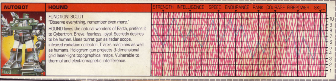 Hound loves the natural wonders of Earth, prefers it to Cybertron. Brave, fearless, loyal. Secretly desires to be human. Uses turret gun as radar scope, infrared radiation collector. Tracks machines as well as humans. Hologram gun projects 3-dimensional grid laser-light topographical maps. Vulnerable to thermal and electromagnetic interference.