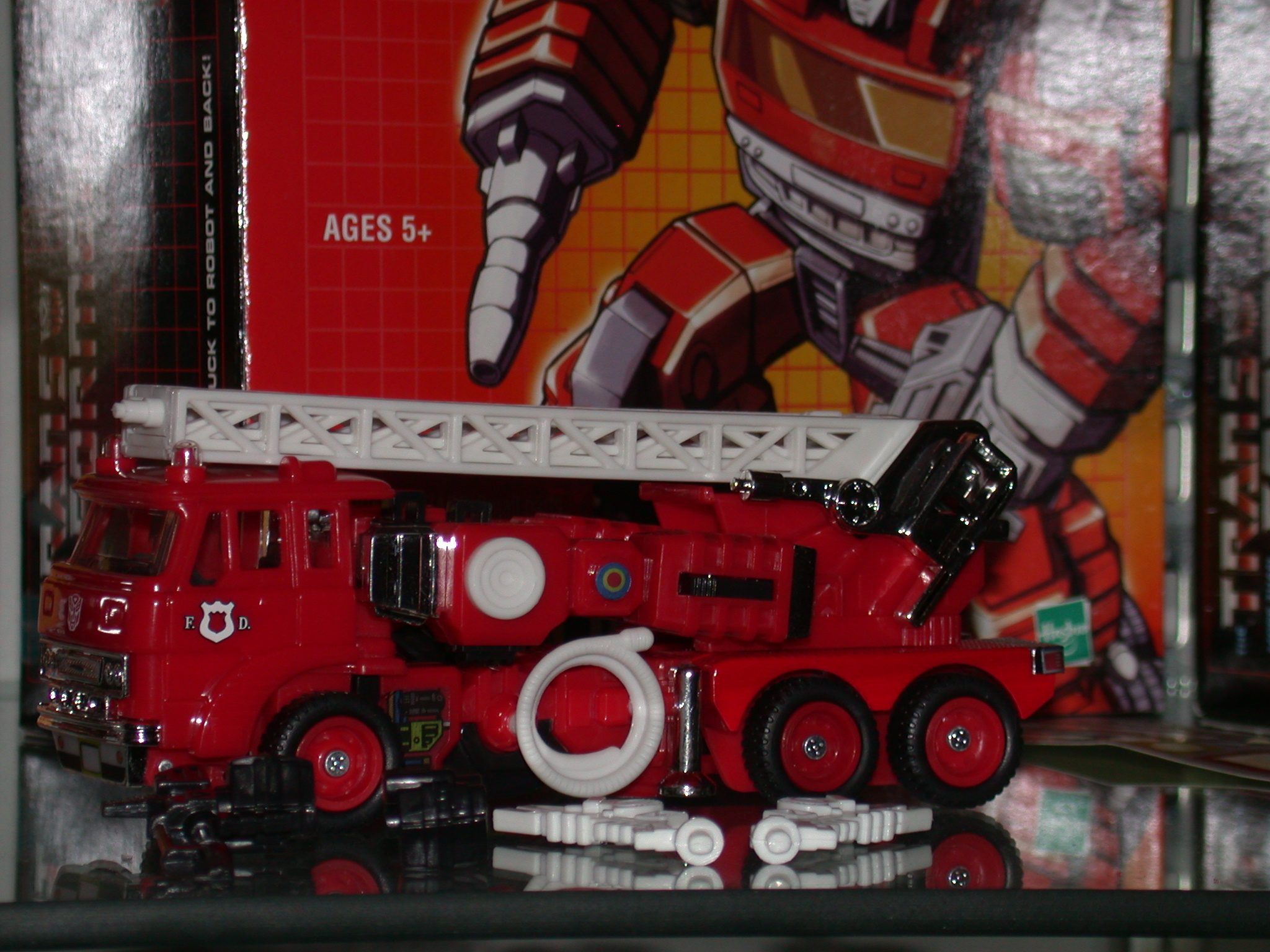 Abilities: In vehicular mode, Inferno has all the capabilities of a normal Earth fire truck. In robot mode, Inferno's strength is among the greatest of the Autobots. His ceramic-plated armored skin makes him resistant to temperatures of up to 8000° C. His extinguisher rifle not only shoots a stream of flame-suppressing foam, but can also stop beams of various types of electromagnetic radiation with its own energy-damping beam. By detaching his hands, he can use his forearms to launch short-range surface-to-air missiles.