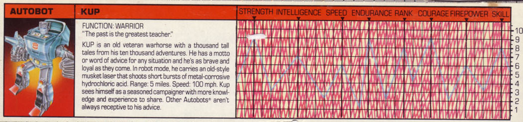 Kup is an old veteran warhorse with a thousand tall tales from his ten thousand adventures. He has a motto or word of advice for any situation and he's as brave and loyal as they come. In robot mode, he carries an old-style musket laser that shoots short bursts of metal corrosive hydrochloric acid. Range: 5 miles. Speed: 100mph. Kup sees himself as a seasoned campaigner with more knowledge and experience to share. Other Autobots aren't always receptive to his advice.