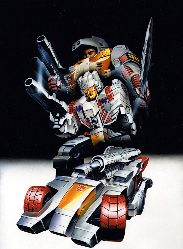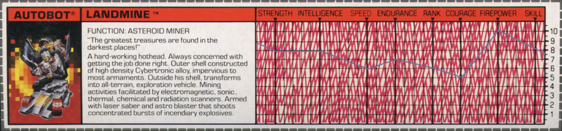 Landmine likes to see himself as a sort of robotic Indiana Jones (he's seen all the films several times!), braving all manner of dangers to uncover minerals or relics. His fellow Autobots just see him as a hothead, albeit a hard-working one. The trouble is, Landmine sometimes sees his job as a bit on the boring and unglamorous side. He's very good at what he does but yearns for something more. Landmine loves adventure stories, be they literary, celluloid, or video, and wants very much to live out his fantasies. That he's an Autobot warrior, waging an epic war against the evil Decepticons (an adventure by anyone's standards), doesn't seem to be enough. He fears others think he's as old and dusty as some of the artifacts he unearths. Nevertheless, once he's given a job to do, all Landmine's concerned with is getting it done right! Optimus Prime appreciates such dependability and wishes he could convince Landmine that he fulfills an important and necessary role in the Autobot war effort. The minerals he brings back are used as alternative power sources, fueling machinery, weapons... and Transformers. Still, thinks Landmine, it would be nice to rescue the odd maiden and battle the odd dragon!