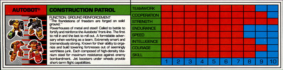 Profile: Powerhouses of metal and steel! Called to battle to fortify and reinforce the Autobots' front line. The first to roll in and the last to roll out. A formidable adversary when working as a team. Extremely smart and tremendously strong. Known for their ability to organize and build a towering fortress out of seemingly worthless junk. Each composed of high-density titanium steel for maximum resistance against enemy bombardment, Jet boosters under wheels provide short term flight capabilities.