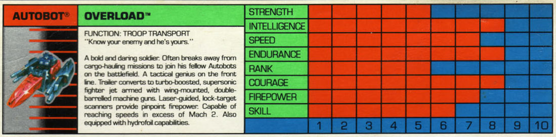 Profile:A bold and daring soldier. Often breaks away from cargo-hauling missions to join his fellow Autobots on the battlefield. A tactical genius on the front line. Trailer converts to turbo-boosted, supersonic fighter jet armed with wing-mounted, double-barrelled machine guns. Laser guided, lock-target scanners provide pinpoint firepower. Capable of reaching speeds in excess of Mach 2. Also equipped with hydrofoil capabilities.