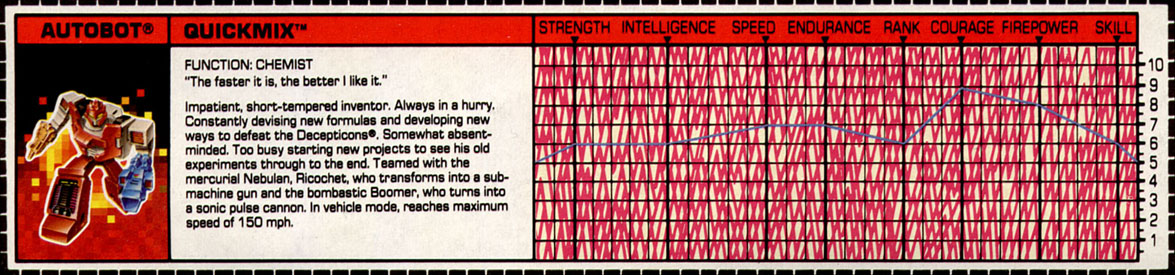 Profile: Quickmix was a crabby, absent-minded professor at the Computechnic Institute of Microprocessor Engineering on Cybertron at the time Autobot-Decepticon hostilities began millions of years ago. His specialty was developing new materials that possessed enhanced energy-transmitting properties, a technology that, in the wrong hands, could be applied to improving weaponry. Although he wanted no part of the war, after repeated raids on his laboratory by a band of Decepticon bandits, Quickmix felt compelled to join the Autobots. But first, as going away present of sorts, he rigged his lab to blow up the next time it was broken into. Shortly thereafter, he returned. Amid the rubble of the devastated lab, Quickmix couldn't find enough pieces left of the Decepticon bandits to make into a charm bracelet. He achieved instant popularity among his new Autobot comrades. Now they know him as much for his impatience and short temper as for his brilliant inventions. He's constantly devising new formulas and gadgets to use against the Decepticons. In fact, he's so busy beginning new projects that he rarely sees old ones through to completion.