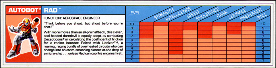 Profile:With more moves than an all-pro halfback, this clever, cool-headed daredevil is equally adept at combating Decepticons or calculating the coefficient of friction for a rocket booster. Paired with Lionizer, a roaring raging bundle of overheated circuits who can change into an atom-smashing blaster at the drop of a microchip... unless Rad can cool his engines first.
