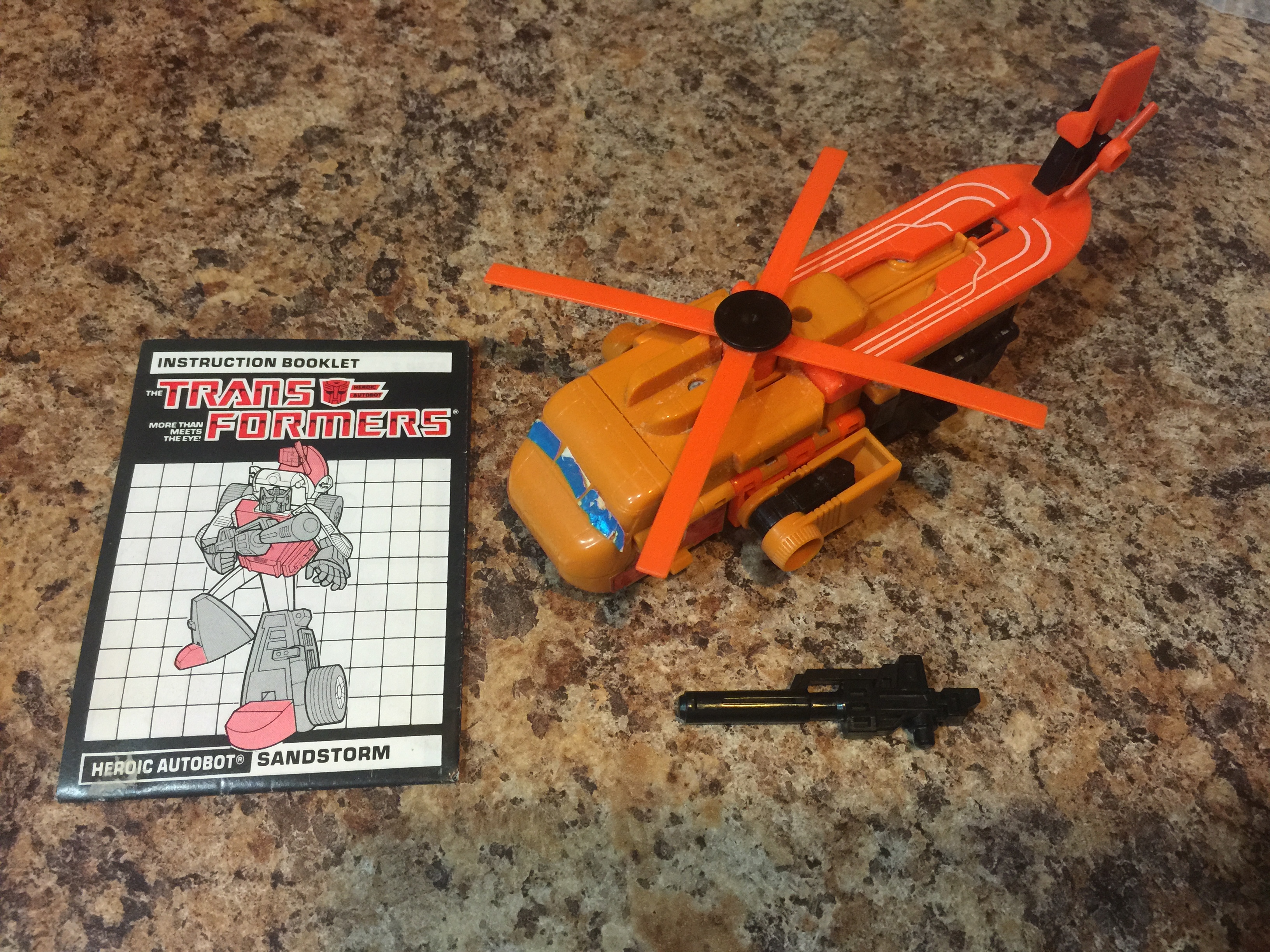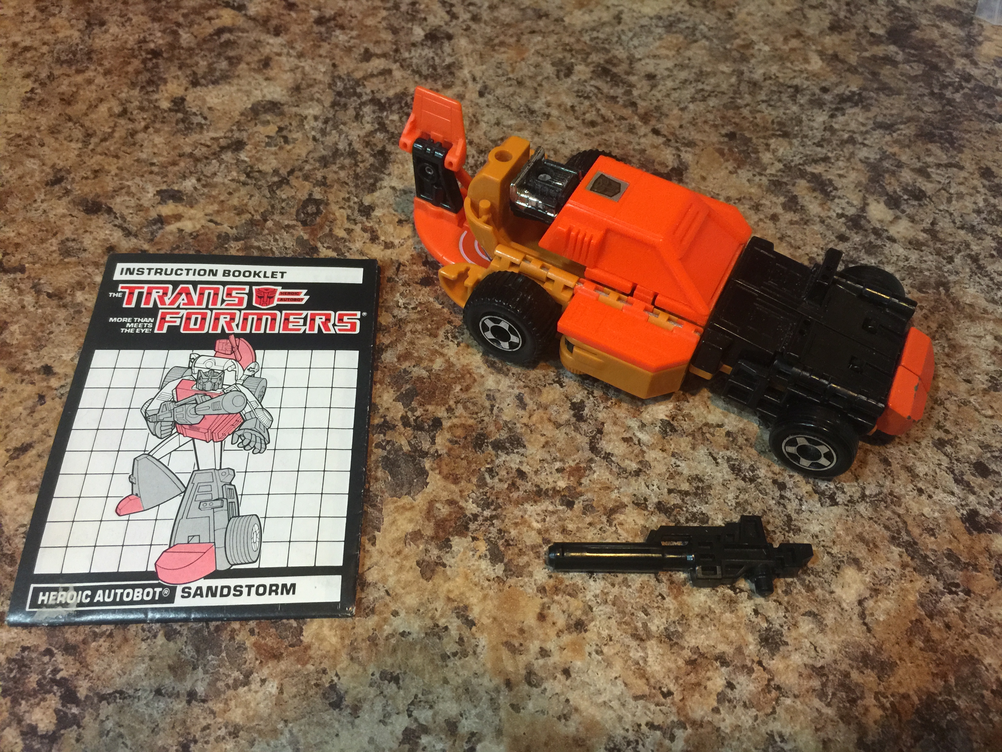**I got Sandstorm in October 2015 on a good deal eBay purchase.  He is complete with his instructions and Sandblaster Gun.  He is in okay cosmetic condition but as of time of purchase needs stickers, has significant chrome wear on the engine on the back of his head and the rims on the driver side.  Has some paint chips on his feet/front bumper.