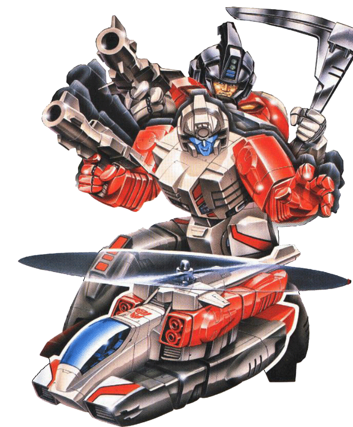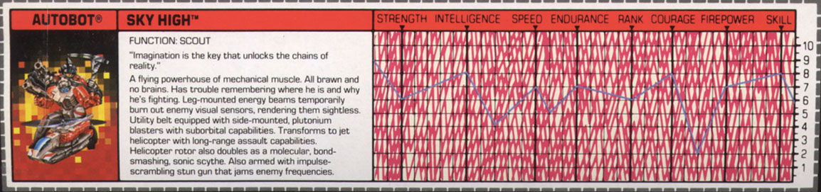 A flying powerhouse of mechanical muscle. All brawn and no brains. Has trouble remembering where he is and why he's fighting. Leg-mounted energy beams temporarily burn out enemy visual sensors, rendering them sightless. Utility belt equipped with side-mounted, plutonium blasters with suborbital capabilities. Transforms to jet helicopter with long-range assault capabilities. Helicopter rotor also doubles as a molecular, bond-smashing, sonic scythe. Also armed with impulse-scrambling stun gun that jams enemy frequencies.
