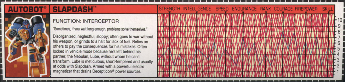 Disorganized, neglectful, sloppy; Often goes to war without his weapon, or grinds to a halt for lack of fuel. Relies on others to pay the consequences for his mistakes. Often locked in vehicle mode because he's left behind his partner, the Nebulan, Lube, without whom he can't transform. Lube is meticulous, short-tempered, and usually at odds with Slapdash. Armed with a powerful electro magnetizer That drains Decepticon power sources.