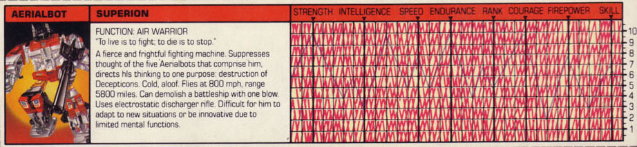 Weaknesses: Superion finds it difficult to adapt to new situations and to be innovative. His thought processes are too primitive to allow for such higher mental functions. This often restricts him in battle. Although incredibly strong and resistant to most artillery and beam weapons, he does have certain "pressure points" - areas of structural weakness where one component Aerialbot connects to the next - that are particularly vulnerable to attack.