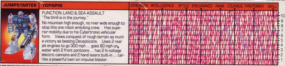 Profile: No mountain is high enough, no river is wide enough to stop this one-robot wrecking crew. The more difficult the terrain to be traversed, the more Topspin likes it. Without the constraints of an Earth vehicular disguise like the ones most of his fellow Autobots have been given by the Ark, he can use the superior mobility and versatility of his Cybertronic vehicular form to go almost anywhere on land or water. On a personal level, he considers his conquest of a steep precipice or a raging river as much a victory as any victory over the Decepticons that may result from an Autobot attack. As Topspin likes to point out, "I take pride in my work."