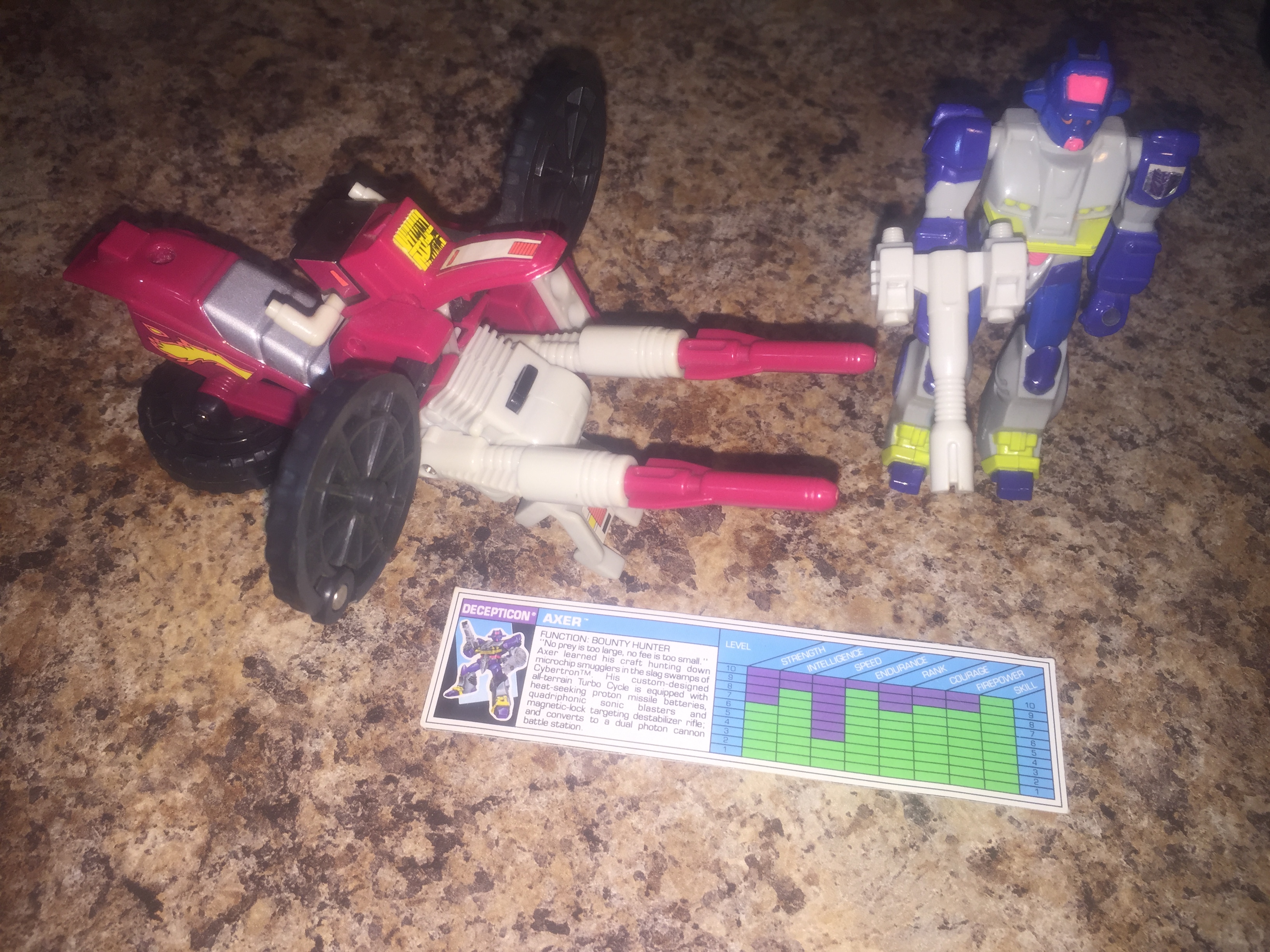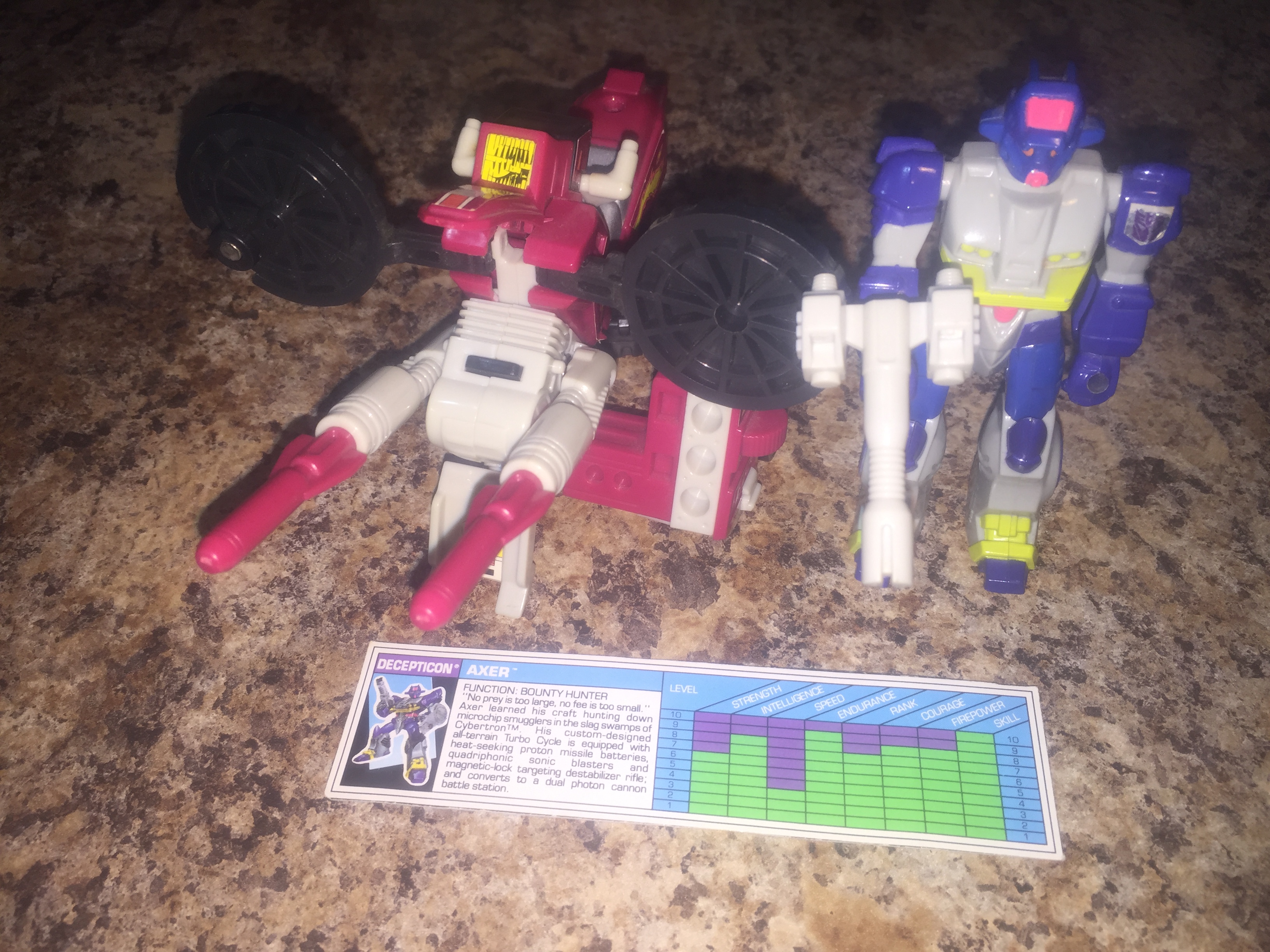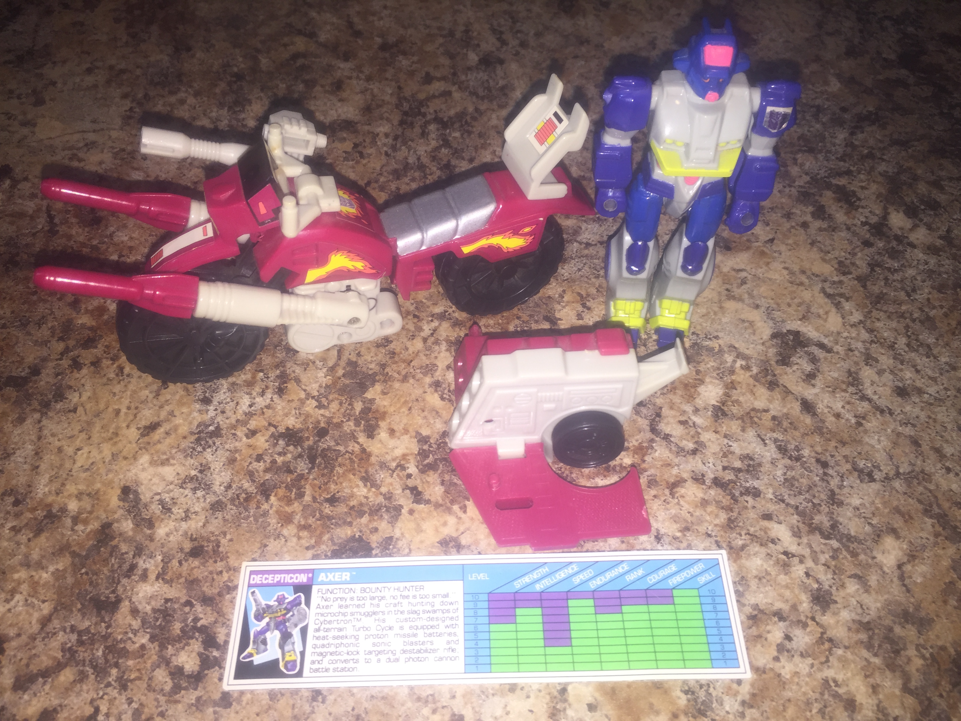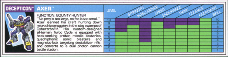 Profile: Axer learned his craft hunting down microchip smugglers in the slag swamps of Cybertron. His custom-designed all-terrain Turbo Cycle is equipped with heat-seeking proton missile batteries, quadrophonic sonic blasters and magnetic-lock targeting destabilizer rifle; and converts to a dual photon cannon battle station.