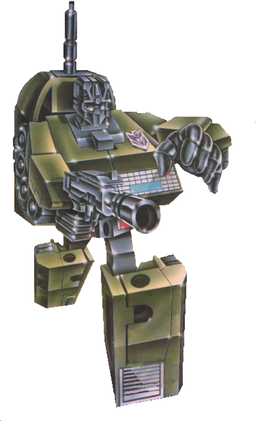 Noisy, irritates all nearby. Hair-trigger temper. blusteringly beligerent... a terrifyingly effective warrior. Enormously strong, resistant to most conventional artillery. As tank, goes 45 mph, range 600 miles. Turret-mounted gun shoots 200 lbs. TNT-equivalent shells, twin sonic cannon shoots powerful, ear-splitting 300-decibel burst of concentrated sound energy in stereo. In robot mode, has 10-Megawatt electron gun. Combines with fellow Combaticons to form "Bruticus." | |||||||