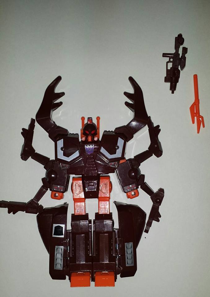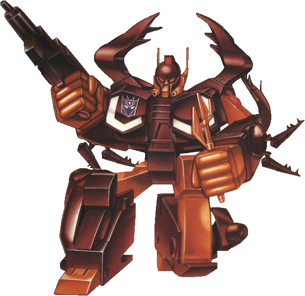 Sneakiest of the Insecticons... if it's not bolted to the floor, it's not safe from his greedy grasp. No challenge is too great; the more difficult something is to steal, the more he wants to steal it. As insect, flies 30mph with two small jets on his back. Pincer-like antennae can slice through 2-inch thick steel. Has twin pinpoint lasers on mouth; can carry 30 tons. As robot has photon cannon.