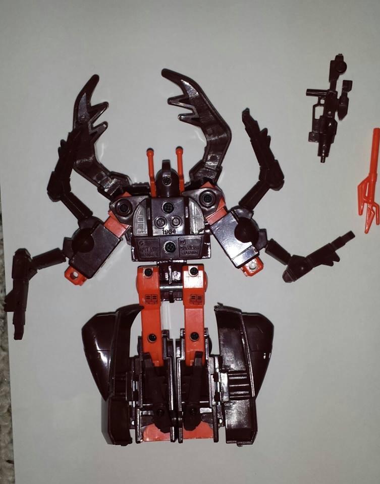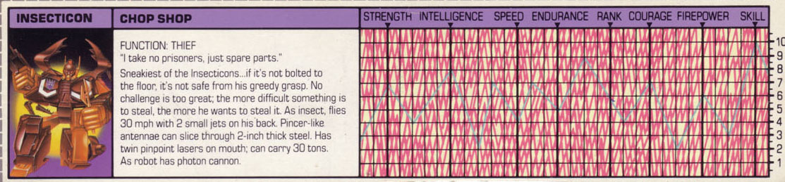 Profile: Sneakiest of the Insecticons... if it's not bolted to the floor, it's not safe from his greedy grasp. No challenge is too great; the more difficult something is to steal, the more he wants to steal it. As insect, flies 30mph with two small jets on his back. Pincer-like antennae can slice through 2-inch thick steel. Has twin pinpoint lasers on mouth; can carry 30 tons. As robot has photon cannon.