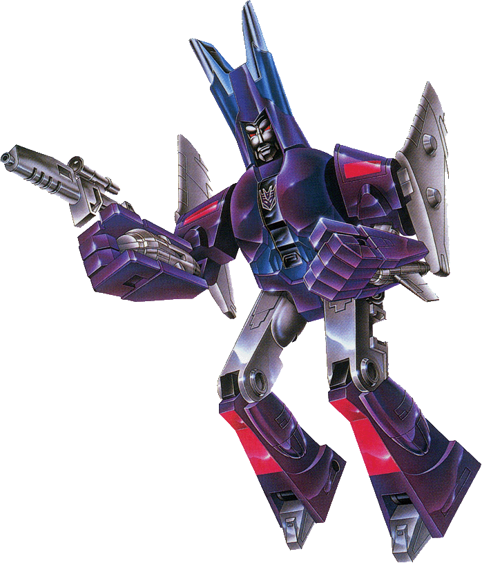 Profile: Cyclonus is a huge and emotionless air-warrior metamorphosized from parts of dead Decepticons and remnants by Unicron. Like Galvatron, he derives vast resources of power and energy through Unicron and so can draw on strength in direct proportion to its need - always being able to become stronger than his opponents because of his access to the infinite reservoir of power that Unicron represents. A dedicated destructor, Cyclonus transforms into a gigantic multi-engine (and perhaps multi-wing) jet fighter. His firepower remains intact and is augmented by an incendiary bomb rack. Cyclonus is capable of an additional transformation, trimming his wings and tail back to assume a space-worthy rocket mode for interstellar pursuit and warfare. He has no personality, no interests other than conquests for the sake of Unicron, and no weakness.