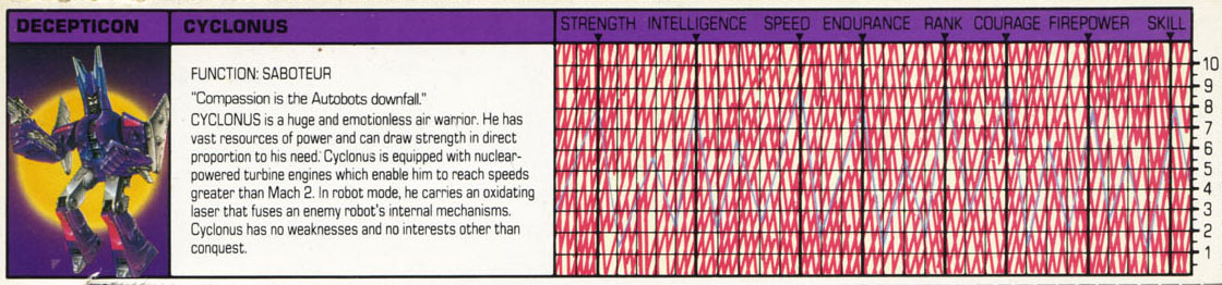 Abilities: In jet fighter mode, Cyclonus is equipped with nuclear-powered turbine engines which enable him to reach speeds greater than Mach 2. In robot mode, he carries an oxidating laser that fuses an enemy robot's internal mechanisms.