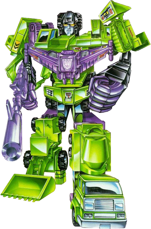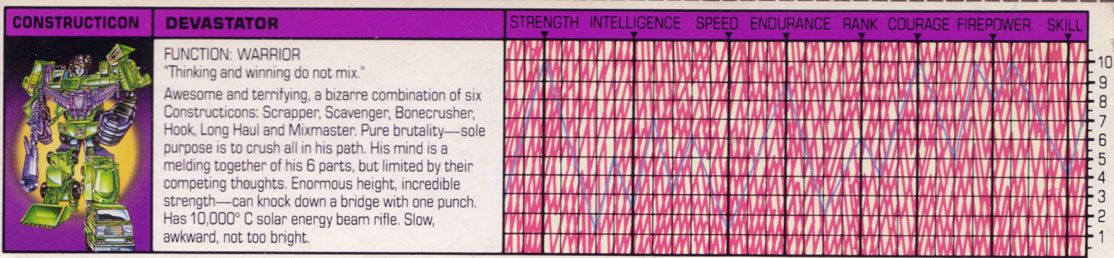 Awesome and terrifying, this Decepticon is a bizarre combination of six Constructicons: Scrapper, Scavenger, Bonecrusher, Hook, Long Haul, and Mixmaster. He is pure brutality as his sole purpose is to crush all in his path. His mind is a melding together of his six parts, but he is limited by their competing thoughts. He possess enormous height and incredible strength -- can knock down a bridge with one punch. He carries a 10,000 degrees Celcius solar energy beam rifle. Devastator is slow, awkward, and not too bright.