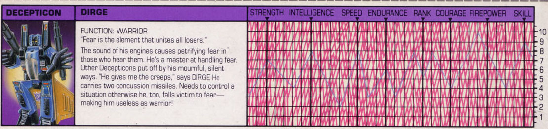Abilities: In jet mode, the sound from Dirge's engines has the uncanny effect of producing spine-tingling (circuit-tingling, in the cases of other robots) fear in nearly everyone who hears it. Apparently, the engines emit a combination of frequencies that has a disorienting, fear-provoking effect on the nervous systems of all those within earshot. He also carries two air-to-air missiles and two automatic machine guns.