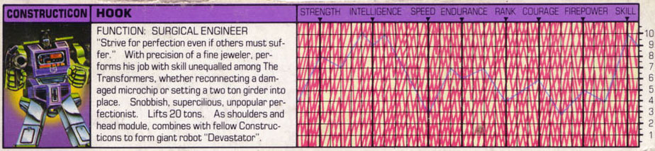 Profile: With the precision of a fine jeweler, Hook performs his job with skill unequalled among the Transformers, whether reconnecting a damaged microchip or setting a two ton girder into place. He's a snobbish, supercilious, unpopular perfectionist who is able to lift 20 tons. As shoulders and head module, combines with fellow Constructicons to form giant robot "Devastator".