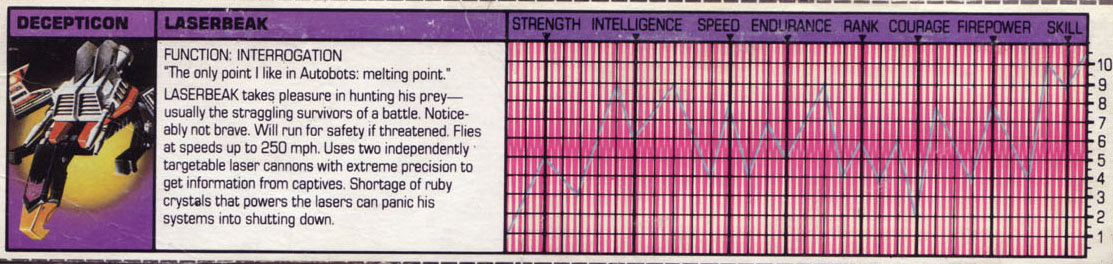 Laserbeak takes pleasure in hunting his prey -- usually the straggling survivors of a battle. Noticeably not brave. Will run for safety if threatened. Flies at speeds up to 250mph. Uses two independently targetable laser cannons with extreme precision to get information from capitves. Shortage of ruby crystals that powers the lasers can panic his systems into shutting down.
