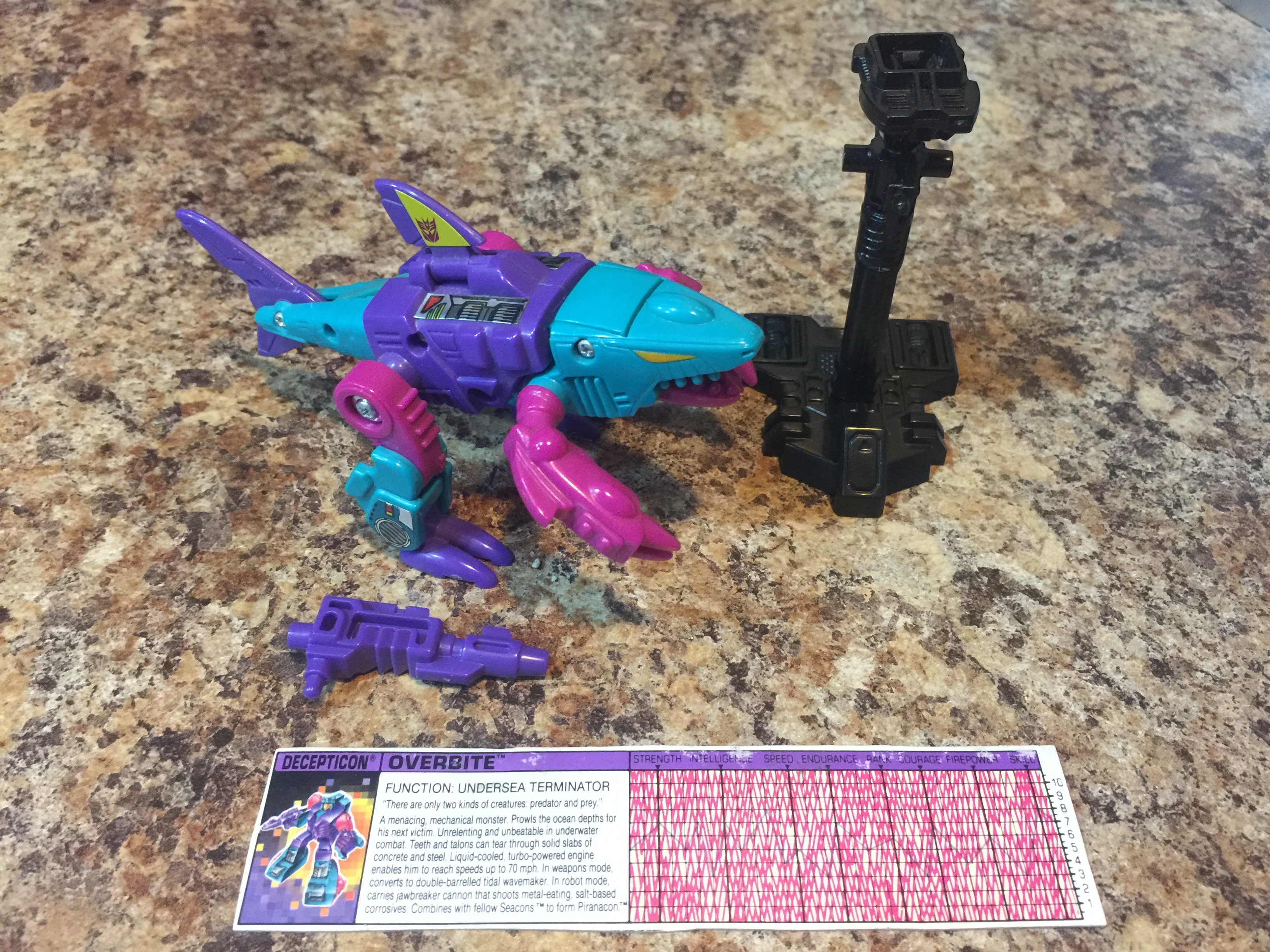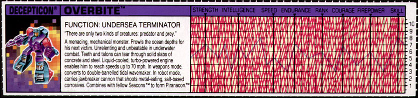 Abilities: In shark mode, Overbite is virtually unbeatable in underwater combat. His attack is unrelenting. His teeth and talons can tear through the hull of a battleship. His liquid cooled, turbo-powered 3,500 horsepower engine propels him through the water at up to 70 knots. He never needs to surface, except for regular maintenance checkups. He carries a freeze beam blaster that can trap any underwater prey in a block of ice. He can transform to an amphibious weapons-base mode, in which he can create tidal waves by wagging his tail at super speed. His front end converts to a jawbreaker cannon, which shoots powerful metal-eating, salt-based corrosives. In this mode, when his fellow Seacons combine to form the super-robot Piranacon, Overbite serves as Piranacon's hand held weapon. Overbite also uses the jawbreaker cannon in robot mode.