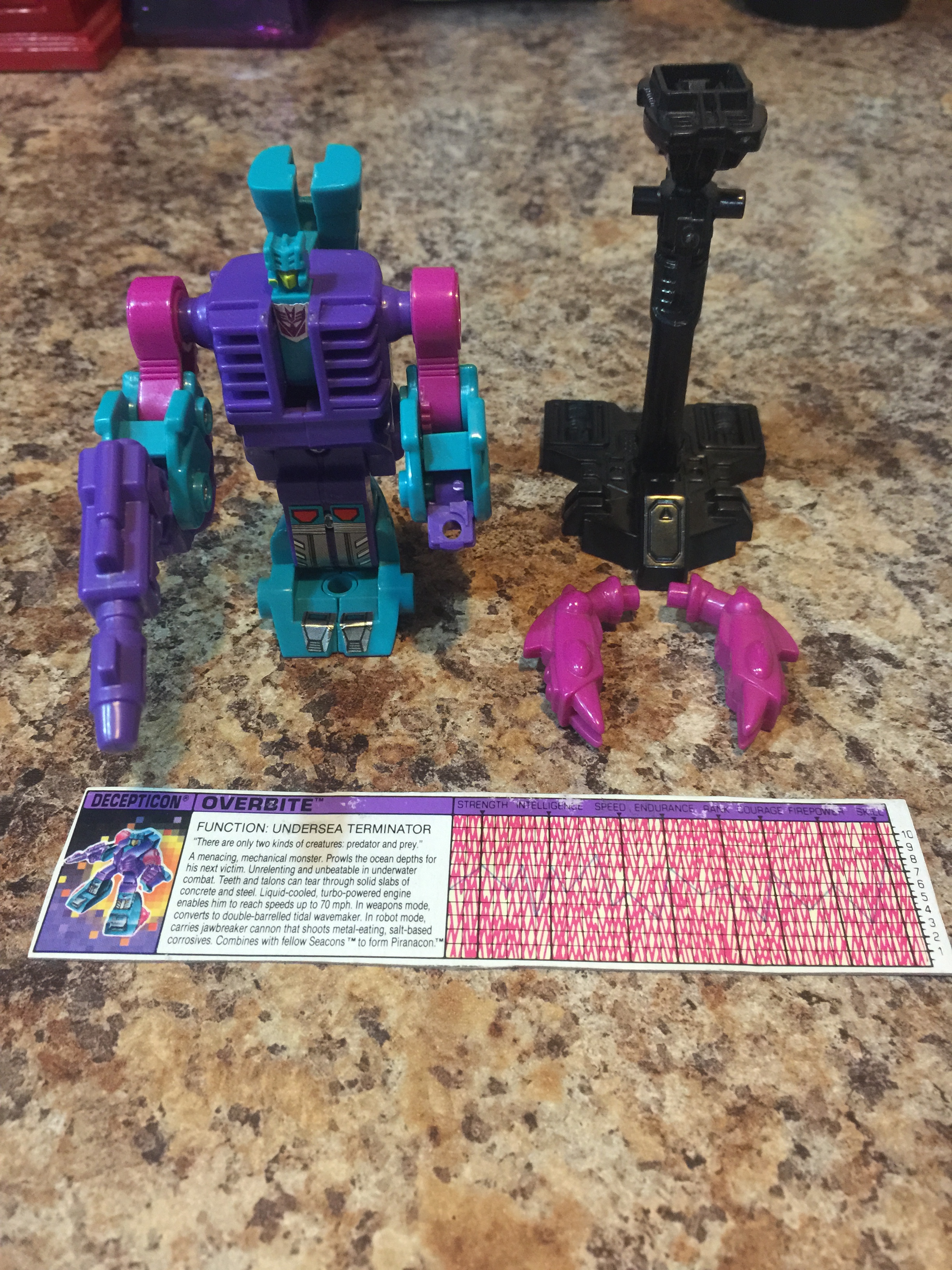 **Overbite is a October 2015 eBay (local seller) purchase that I got to finally complete my Seacons.  The crazy part is in the past couple of years I had bought 2 complete reissue sets of the Seacons, but was not happy with those.  I needed the originals, so here I am working to finally complete that set.  He is complete with his Left and Right Monster Arms, Jawbreaker Cannon, the Weapon Stand Base, Tripod Rifle, and the Connector. **