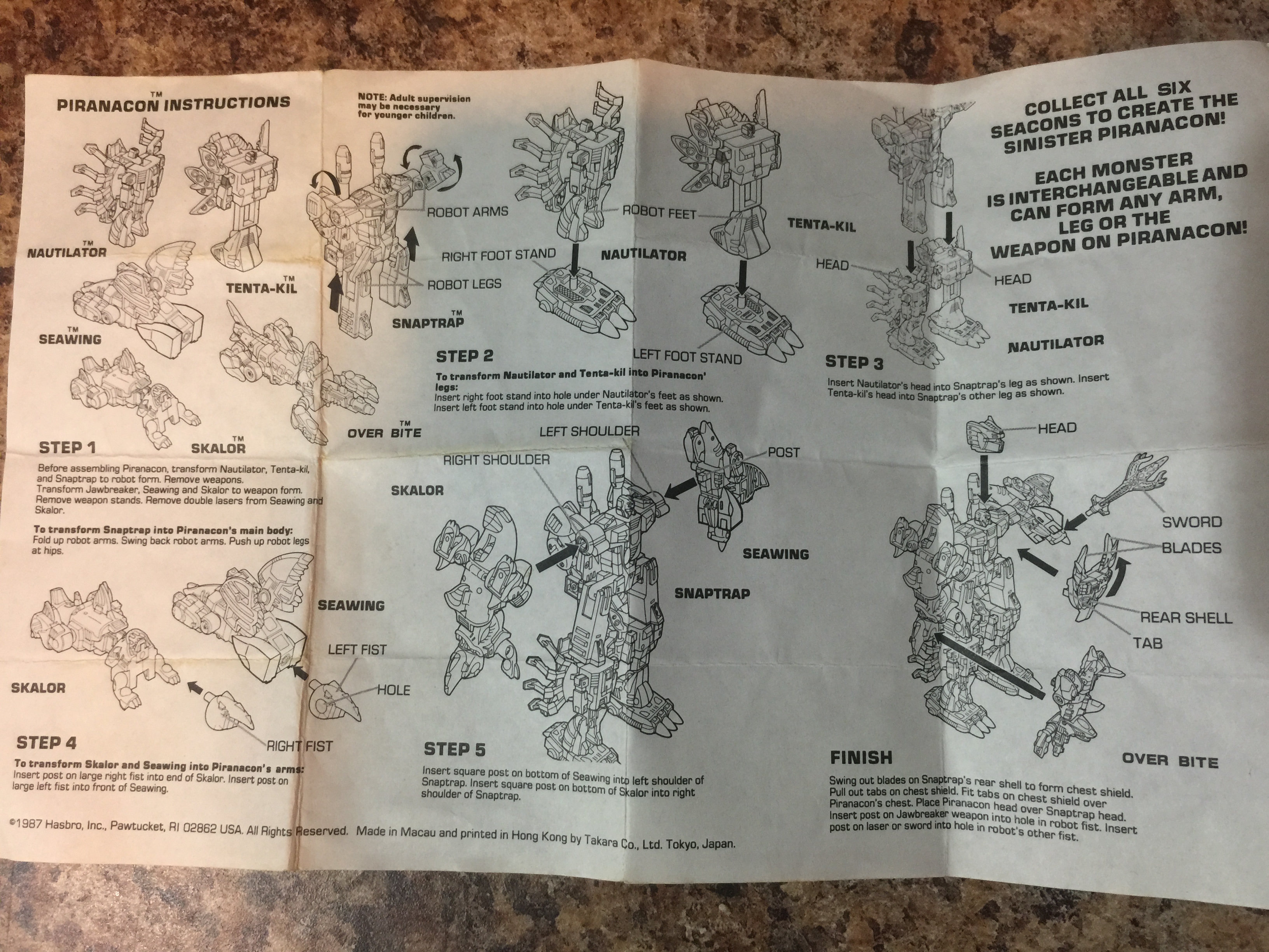 A menacing, mechanical monster. Prowls the ocean depths for his next victim. Unrelenting and unbeatable underwater combat. Teeth and talons can tear through solid slabs of concrete and steel. Liquid-cooled, turbo-powered engine enables him to reach speeds up to 70mph. In weapons mode converts to a double barrelled tidal wavemaker. In robot mode carries jawbreaker cannon that shoots metal eating, salt-based corrosives. Combines with fellow Seacons to form Piranacon.