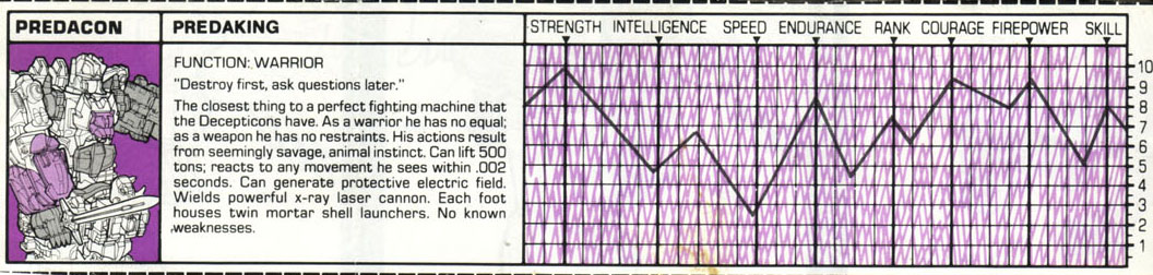 Abilities: Predaking is monstrously strong. He can lift 500 tons without straining a circuit. He reacts to any movement he sees within .002 seconds. He can generate a powerful electric field about himself that dampens or repels any energy-based beams and prevents other Transformers from approaching any closer than 10 feet. One punch from his fist can shatter a 50-foot reinforced concrete cube. He wields a powerful X-ray laser cannon, whose blast has the equivalent explosive force of 100 tons of TNT. Each of his feet has a double-barrelled mortar shell launcher within it.