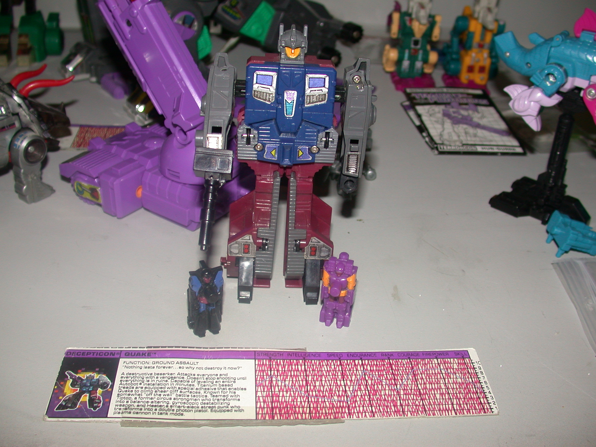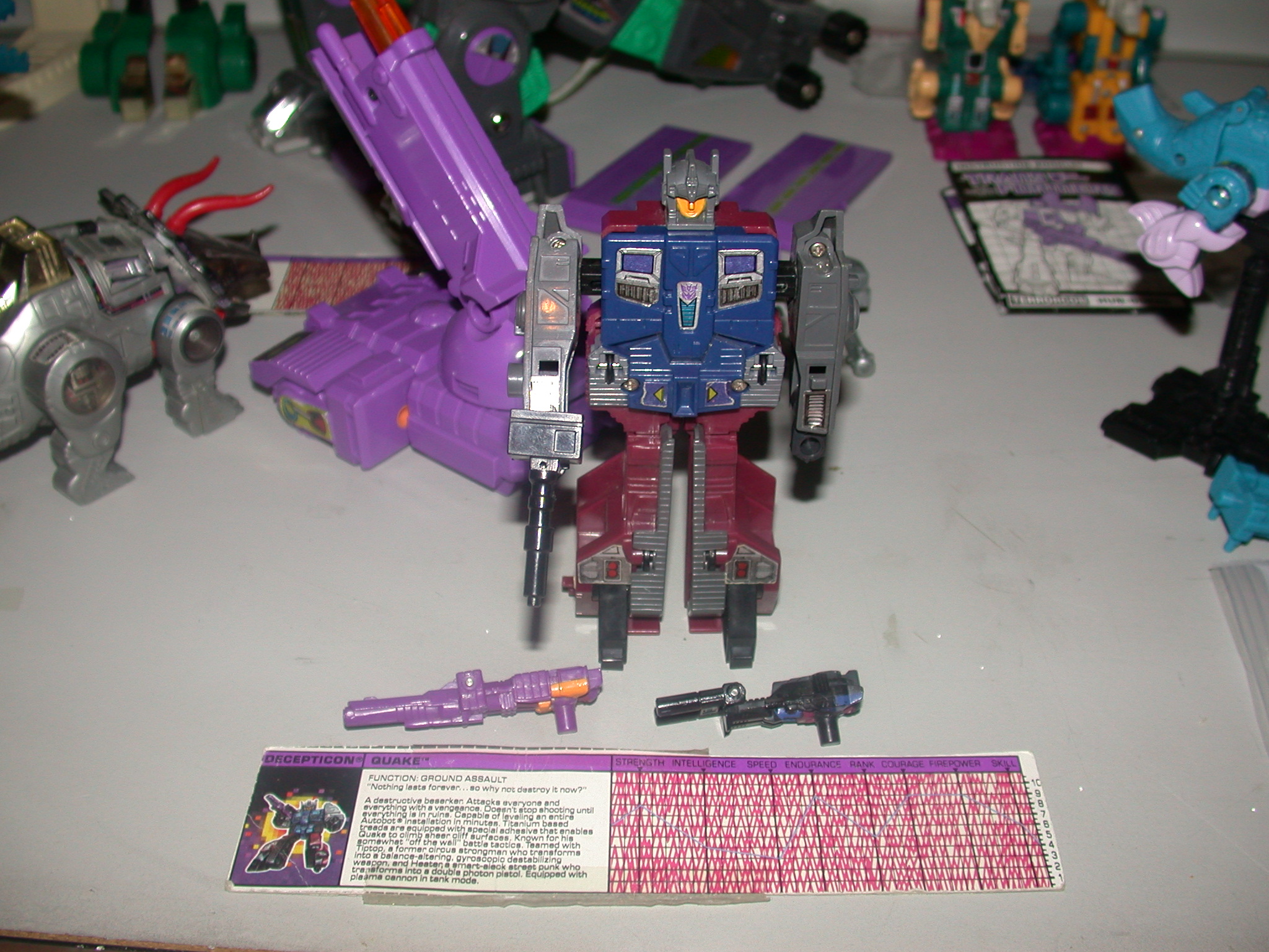 Profile: Reason has never been known to slow the raging onslaughts of this destructive berserker. Quake attacks everyone and everything with a vengeance. Only persistent cries from his fellow Decepticons of "point your guns the other way" and "the Autobots are over there, you idiot" prevent him from blasting those on his own side. Otherwise, he doesn't stop shooting until everything around him lies in ruins or he runs out of ammo, whichever comes first. Quake gives Megatron sufficient reason to question one of his most cherished theories of military strategy: "I'd rather have a fool who shoots than ten trained warriors who hold their fire." As Megatron has learned, when that fool is Quake, the gun can be pointing at you.