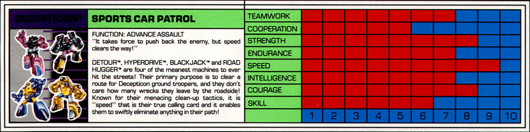 "It takes force to push back the enemy, but speed clears the way!"Profile: Detour, Hyperdrive, Blackjack, and Road Hugger are four of the meanest machines ever to hit the streets! Their primary purpose is to clear a route for Decepticon ground troopers, and they don't care how many wrecks they leave by the roadside! Known for their menacing clean-up tactics, it is "speed" that is their true calling card, and it enables them to swiftly eliminate anything in their path!