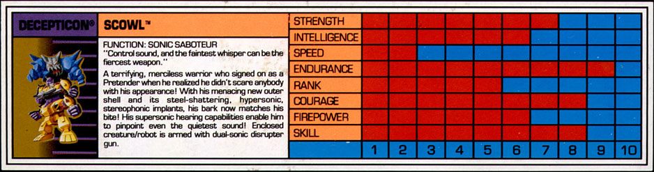 A terrifying, merciless warrior who signed on as a Pretender when he realized he didn't scare anybody with his appearance! With his menacing new outer shell and his steel-shattering, hypersonic, stereophonic implants, his bark now matches his bite! His supersonic hearing capabilities enable him to pinpoint even the quietest sound! Enclosed creature/robot is armed with dual-sonic disrupter gun. | |||||||