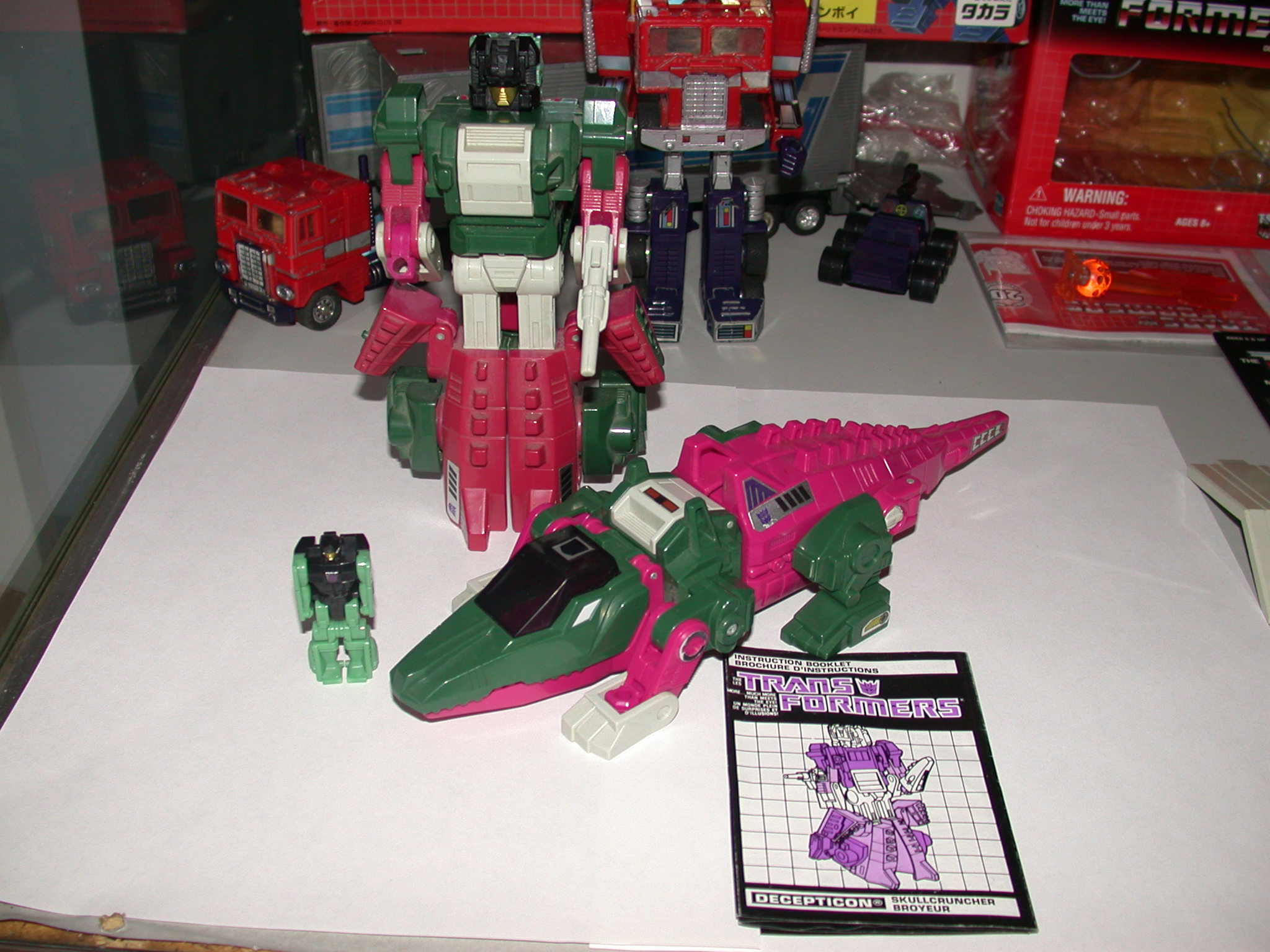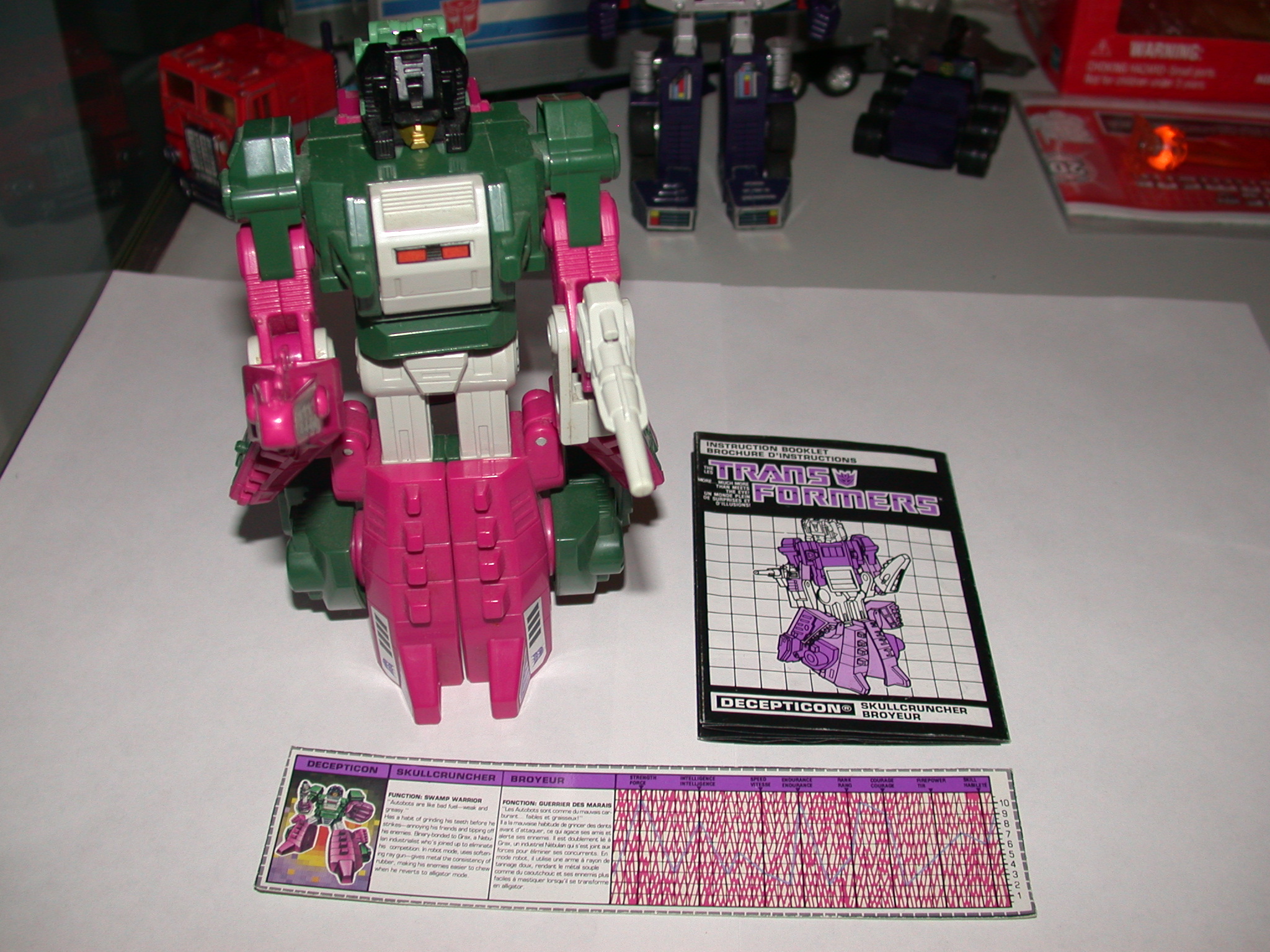 **I managed to get two different Skullcrunchers. The first is near-mint and complete with his tail, Ray Gun, headmaster Grax, Instructions and both an American techspec and what I believe is a Canadian techspec (two languages). The second skullcruncher is in above average condition, with moderate sticker wear. he includes his body and headmaster Grax. I am missing his Tail and gun.**