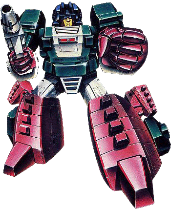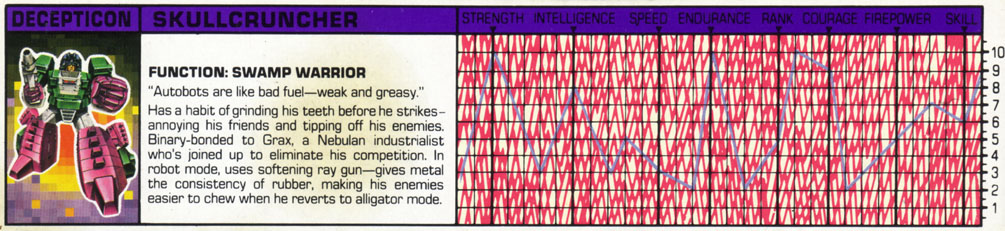 Profile: Like Weirdwolf, Skullcruncher has a bad habit of tipping off his enemies just before he strikes. Instead of talking to himself, Skullcruncher grinds his metal teeth, producing a sound like nails being scraped down a blackboard, only amplified tenfold. Apart from tipping off Autobots, it sets Decepticons on edge. No one wants Skullcruncher as a partner, and if they do get stuck with him, they do their best to avoid combat, knowing only too well what will precede it. Though he professes to hate the taste of Autobots, Skullcruncher goes about eating them (after they've run, and if he manages to catch them) with considerable zest and relish. It's rare that there's enough left of an Autobot to fill an energon pod after Skullcruncher's finished with him. Whether he actually digests his victims or just does it for the fun of it isn't clear. Though tough and strong, Skullcruncher is a bit of mental plodder, stopping to chew in the midst of a raging battle. Too much to think about tends to annoy Skullcruncher, so he focuses on one job (or meal!) at a time. His Nebulan partner is Grax, an industrialist who teamed up with Skullcruncher in order to eliminate his business rivals. Skullcruncher was less than impressed - his Nebulan victims were not even 'bite-size' snacks!