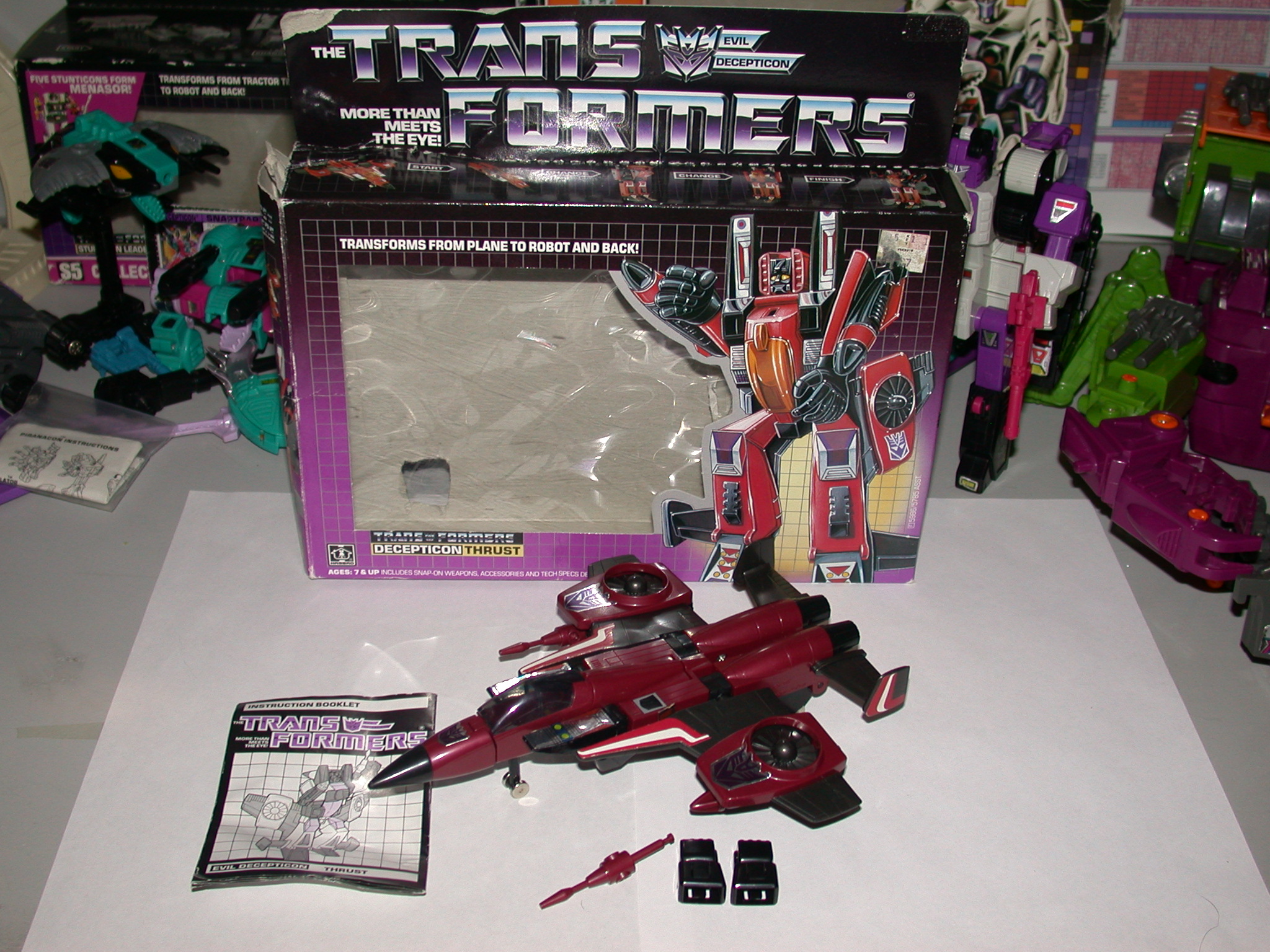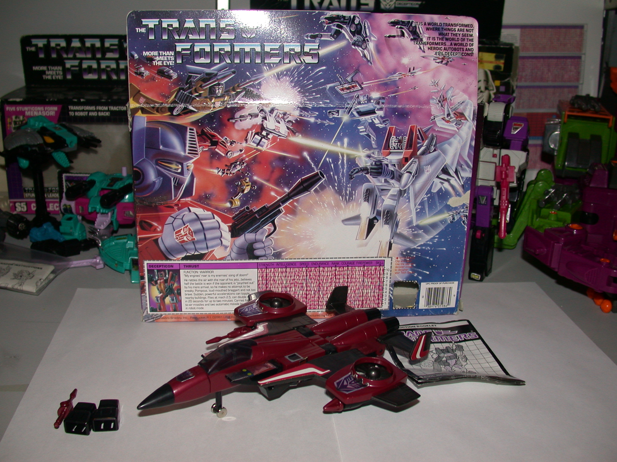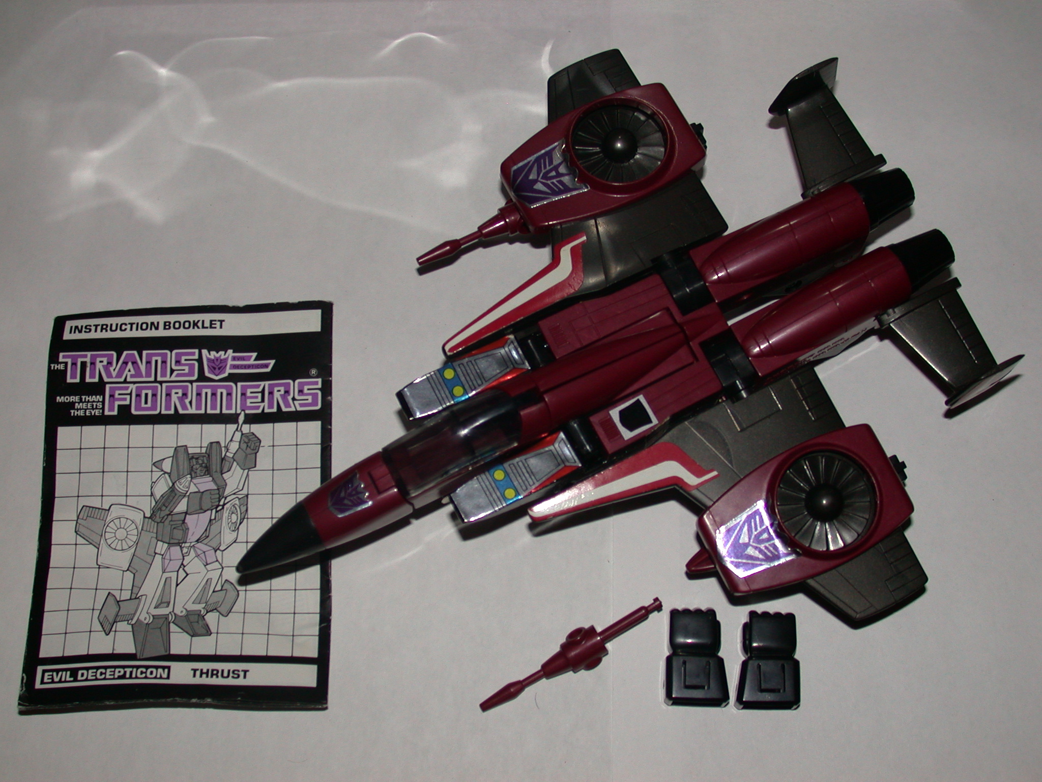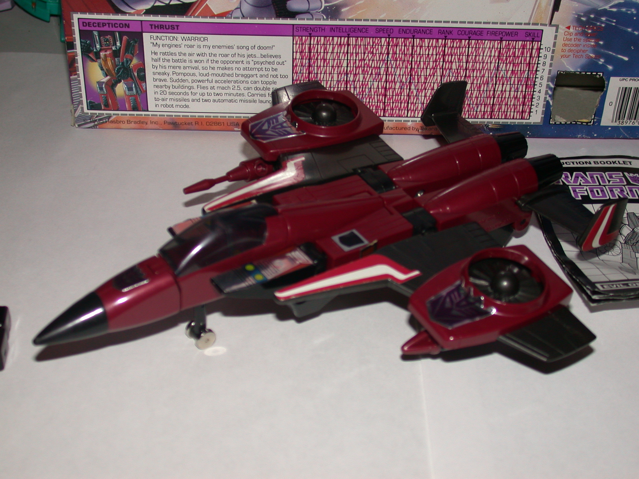 **thrust is a recent addition to my collection, and my one true original jet (not a reissue). I was always a big fans of the jets, so its great to finally add him to my collection. I especially liked how his wings were a different style than the first three that Hasbro had issued, but he was also cooler in my opinion in looks, than Dirge and Ramjet. I went a little crazy with pictures because I like his wings so much. He is my favorite Jet as far as structure goes, and only has Starscream (character wise) as competition. I will also attach a picture of the worlds smallest version I have of him, when I get a chance.**