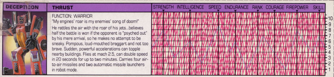 Profile: Rattling the very air with the roar of his jet engines, Thrust is one Decepticon who cares little for the ways of deceit. He believes that half the battle is won if he can "psych out" his enemy by his mere arrival, and so he makes no attempt to be sneaky. His ability to suddenly and powerfully accelerate can literally shake apart a nearby building, and he delights in the havoc that ensues. He is a loud-mouthed braggart who is prone to pompously claim certain victory before a fight has barely begun. But in truth, his courage is as much bluster and noise as his actions and words: a strong counterattack by an opponent usually results in a view of Thrust's tailwings as he recedes into the distance.