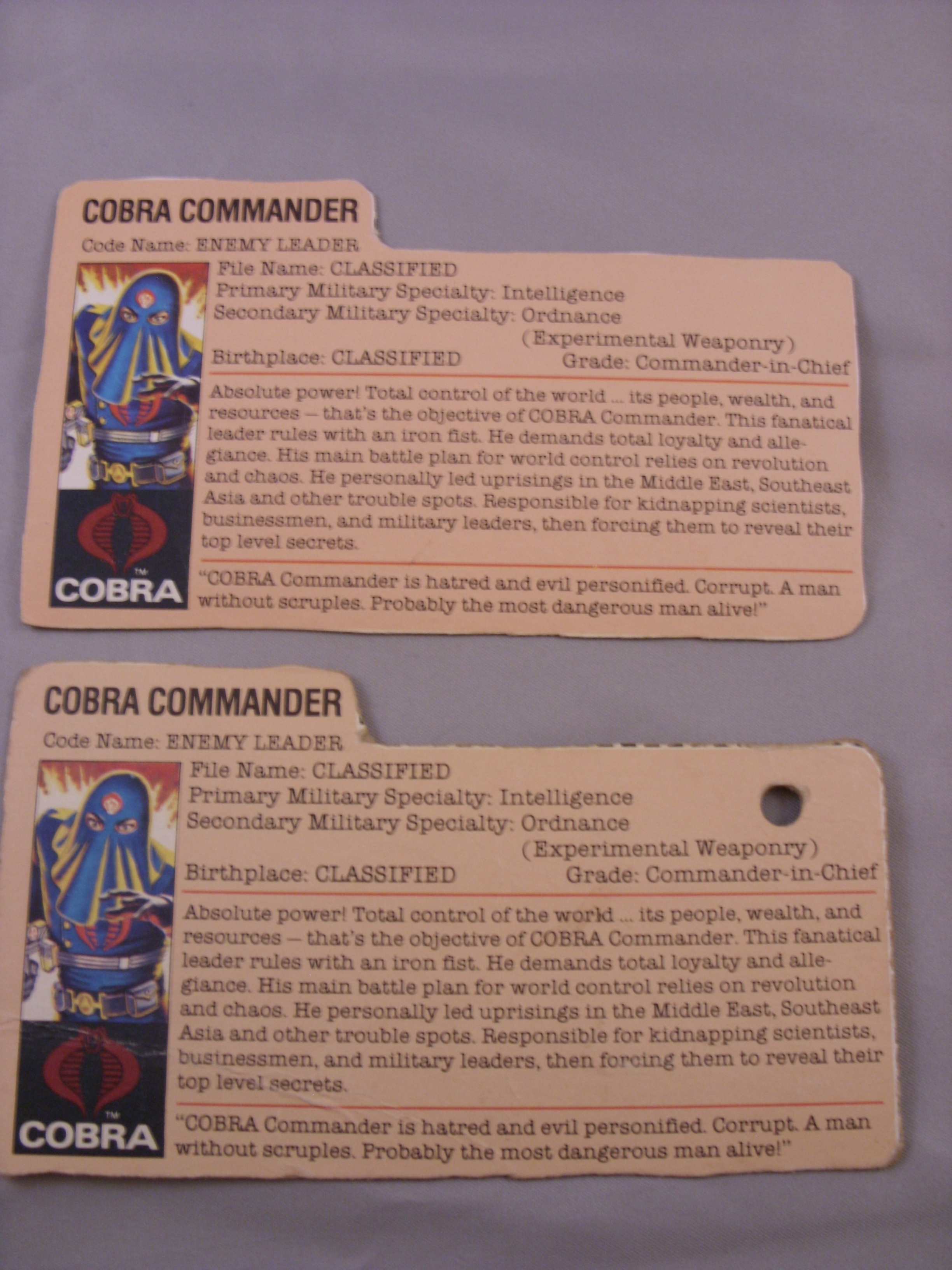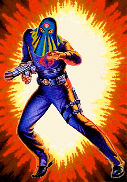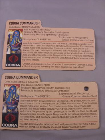 Code Name: ENEMY LEADER Absolute power! Total control of the world...its people, wealth, and resources--that's the objective of COBRA Commander. This fanatical leader rules with an iron fist. He demands total loyalty and allegiance. His main battle plan for world control, relies on revolution and chaos. He personally led uprisings in the Middle East, Southeast Asia and other trouble spots. Responsible for kidnapping scientists, businessmen, and military leaders, then forcing them to reveal their top level secrets. "COBRA Commander is hatred and evil personified. Corrupt. A man without scruples. Probably the most dangerous man alive!"