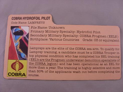 Lampreys are the elite of the COBRA sea-arm. To qualify for Lamprey training, a candidate must be a COBRA Trooper in top physical condition who has completed his EEL training (EEL's are the Frogmen underwater demolition specialist of the COBRA legion) and has been operational as an EEL for more than a year. The training is highly selective and more than 50% of the applicants wash out before completing the course.
