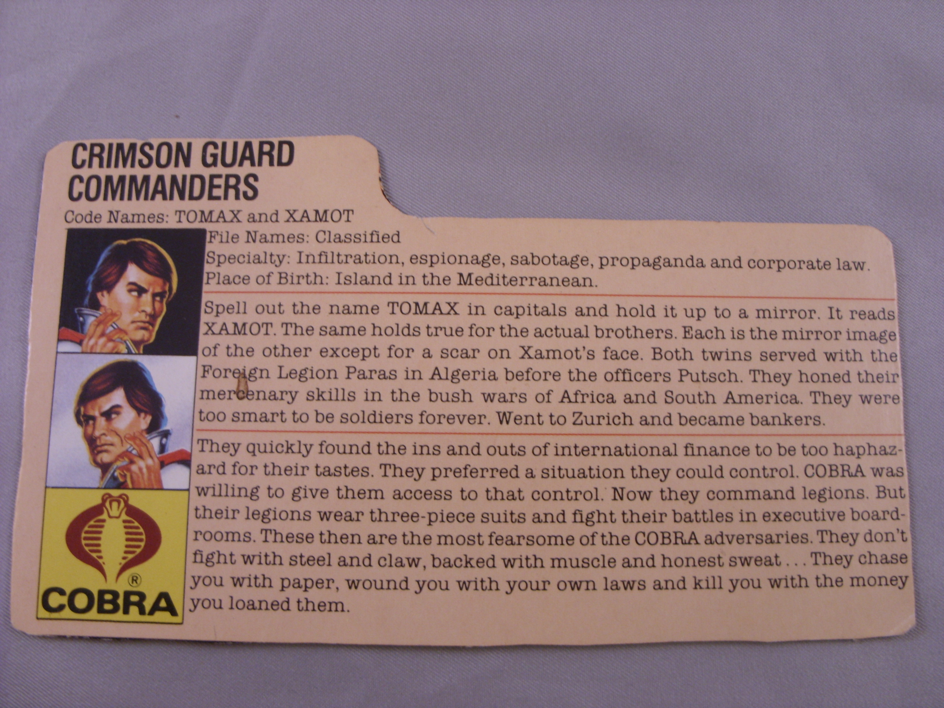 They quickly found the ins and outs of international finance to be too haphazard for their tastes. They preferred a situation they could control. COBRA was willing to give them access to that control. Now they command legions. But their legions wear three-piece suits and fight their battles in executive board rooms. These then are the most fearsome of the COBRA adversaries. They don't fight with steel and claw, backed with muscle and honest sweat... They chase you with paper, wound you with your own laws and kill you with the money you loaned them.