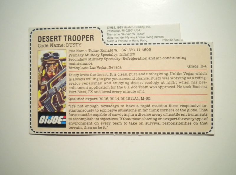 Dusty loves the desert. Is is clean, pure and unforgiving. Unlike Vegas which is always willing to give you a second chance. Dusty was working as a refrigerator repairman and studying desert ecology at night when his pre-enlistment application for the G.I.Joe Team was approved. He took Basic at Fort Bliss, TX and loved every minute of it.