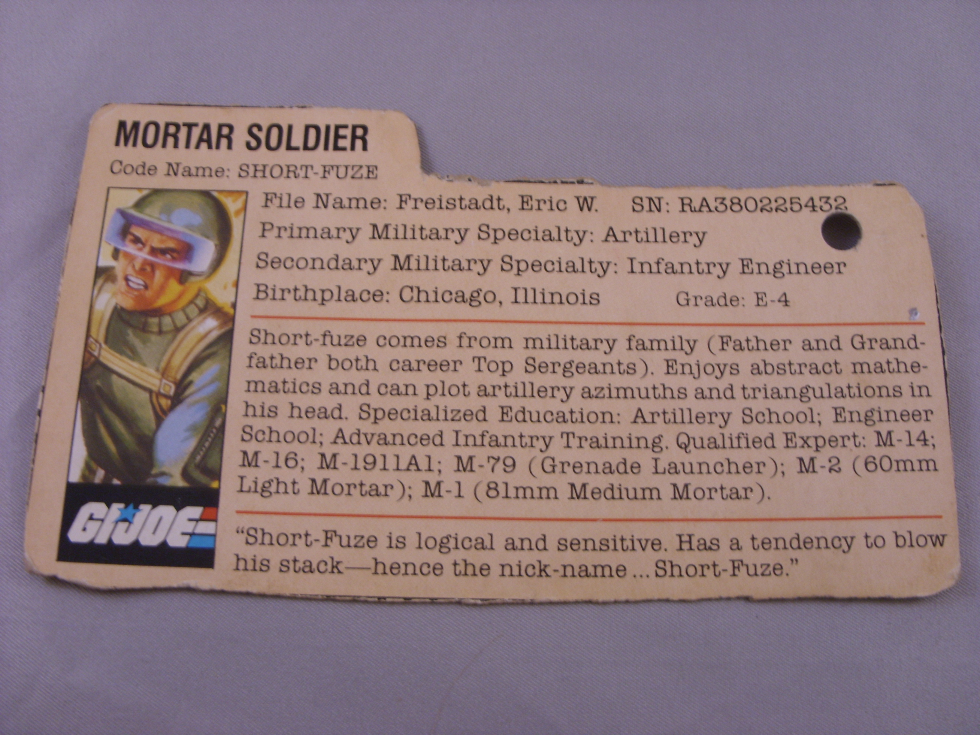 My Personal Notes: Short-Fuze was one of the early Joes I remember getting. It is unfortunate, I remember having more than one of his mortar canons, but I now have somehow lost them all and have resorted to using the one from the accessory pack. He is complete otherwise, including his file card.